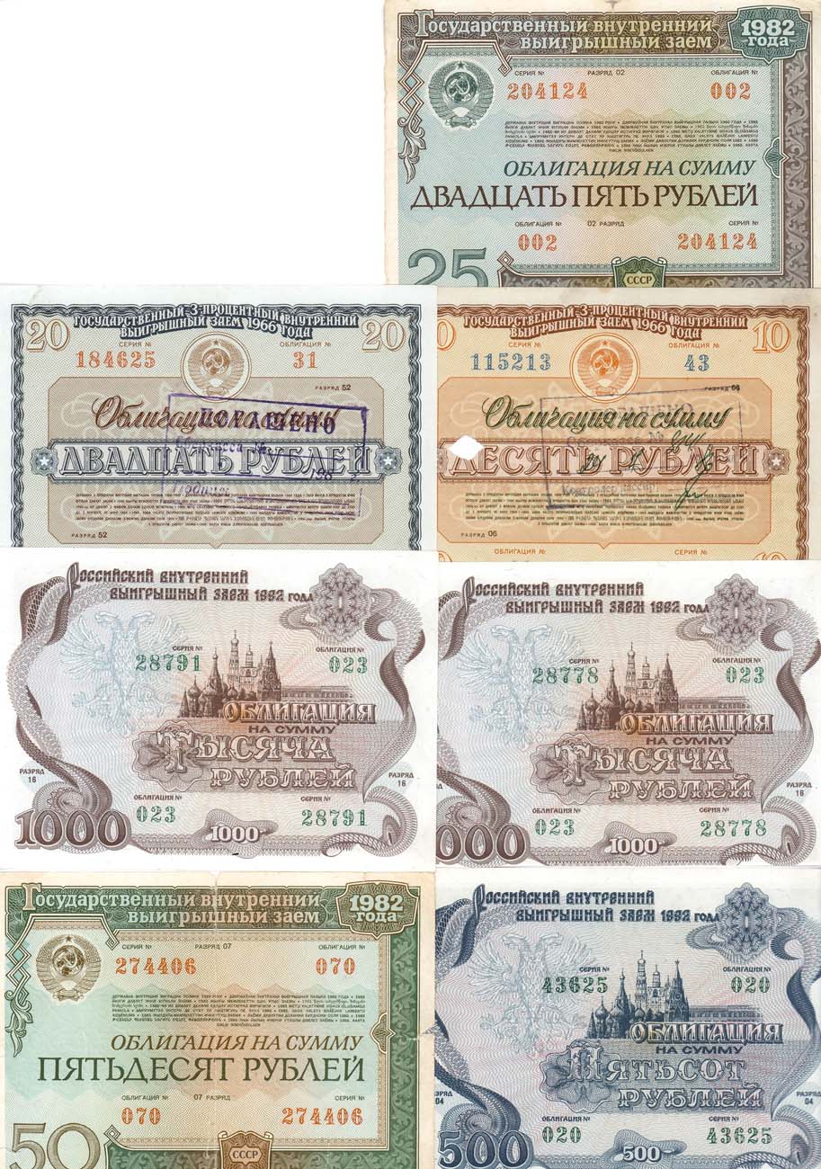 Облигация. 10 рублей 1966 года. Погашена. Разряд 06. Серия 115213. №43. XF. Облигация. 20 рублей 1966 года. Погашена. Разряд 52. Серия 184625. №31. XF. Облигация. 25 рублей 1982 года. Разряд 02. Серия 204124. №002. VF/XF. Облигация. 50 рублей 1982 года. Разряд 07. Серия 274406. №070. F. Облигация. 500 рублей 1992 года. Разряд 04. Серия 43625. №020. UNC-. Облигация. 1000 рублей 1992 года. Разряд 16. Серия 28778. №023. UNC-. Облигация. 1000 рублей 1992 года. Разряд 16. Серия 28791. №023. UNC-. F/UNC-.