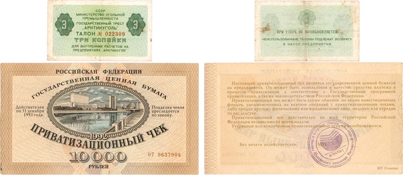 Российская Федерация. Приватизационный чек на 10000 рублей 1992 года. Серия 07 №9637904. Печать Сбербанка. Шахтинского отд. Ростовской области. МТ Гознака СССР. Министерство угольной промышленности. Государственный трест "Арктикуголь" Талон. 3 копейки (1979) года. №022309. VF/XF.