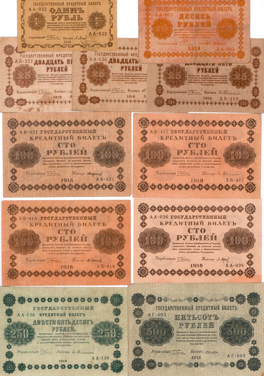 РСФСР. Государственный Казначейский билет. 1 рубль 1918 года. Серия АА-032. Пятаков/Барышев. XF РСФСР. Государственный Казначейский билет. 10 рублей 1918 года. Серия АА-003. Пятаков/Г де Милло. F. РСФСР. Государственный Казначейский билет. 25 рублей 1918 года. Серия АБ-231. Пятаков/Лошкин. XF. РСФСР. Государственный Казначейский билет. 25 рублей 1918 года. Серия АА-136. Пятаков/Осипов. VF. РСФСР. Государственный Казначейский билет. 25 рублей 1918 года. Серия АБ-219. Пятаков/Ев. Гейльман. XF. РСФСР. Государственный Казначейский билет. 100 рублей 1918 года. Серия АВ-421. Пятаков/Стариков. VF. РСФСР. Государственный Казначейский билет. 100 рублей 1918 года. Серия АВ-417. Пятаков/Ев. Гейльман. AU. РСФСР. Государственный Казначейский билет. 100 рублей 1918 года. Серия АВ-414. Пятаков/Осипов. VF. РСФСР. Государственный Казначейский билет. 100 рублей 1918 года. Серия АА-026. Пятаков/Барышев. XF. РСФСР. Государственный Казначейский билет. 250 рублей 1918 года. Серия АВ-421. Пятаков/Ев. Гейльман. VF. РСФСР. Государственный Казначейский билет. 500 рублей 1918 года. Серия АГ-603. Пятаков/Лошкин. VF/XF. F/AU.