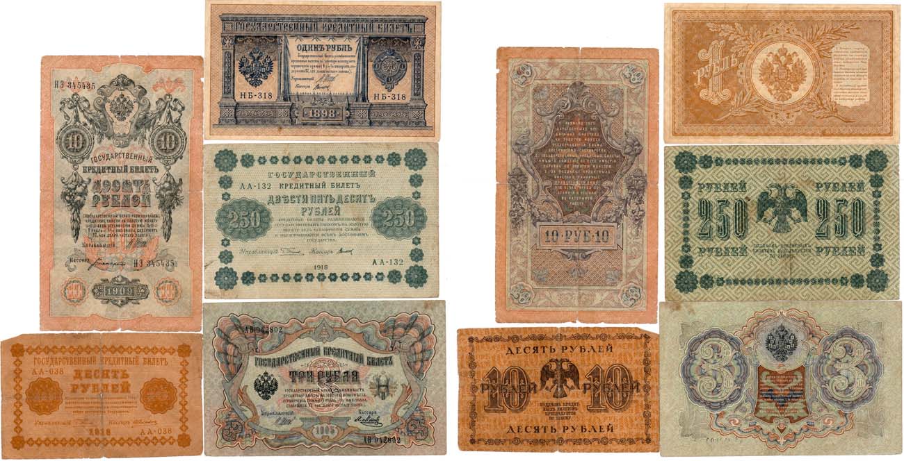 10 рублей 1909 года. Серия НЭ 345435. Подписи Шипов/Богатырев. 3 рубля 1905 года. Серия АВ 942802. Подписи Шипов/Я. Метц. 1 рубль 1898 года. Серия НБ-318. Подписи Шипов/Титов. 250 рублей 1918 года. Серия АА-132. Подписи Пятаков/Титов. 10 рублей 1918 года. Серия АА-038. Подписи Пятаков/А Алексеев. F/VF.