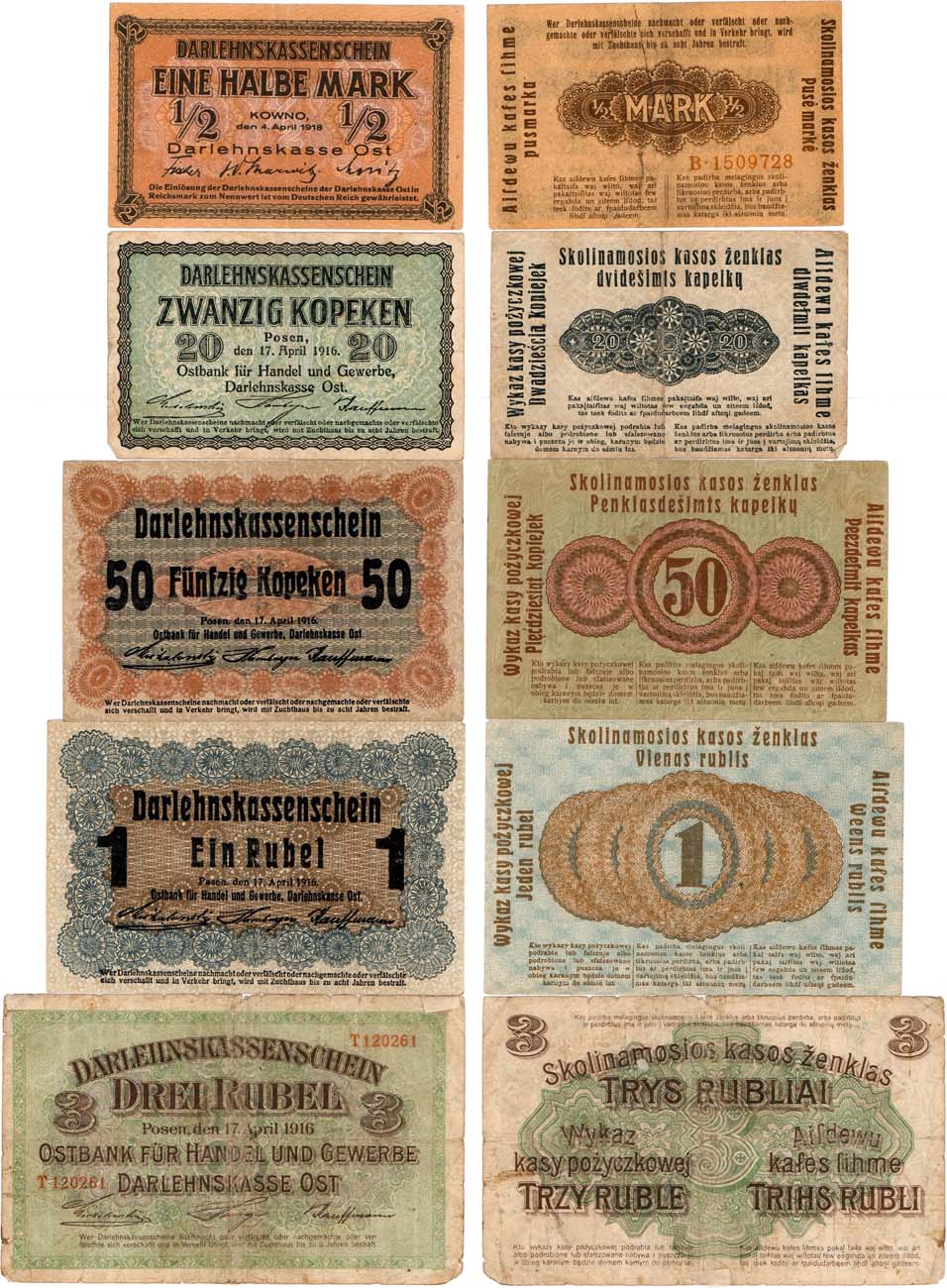 Познань. 3 рубля 1916 года. Серия Т 120261. Ro.460b. Познань. 1 рубль 1916 года. Ro.459b. Познань. 50 копеек 1916 года. Ro.458b. Познань. 20 копеек 1916 года. Ro.457. Каунас. 1/2 марки 1918 года. Ro.464. VF/XF-.