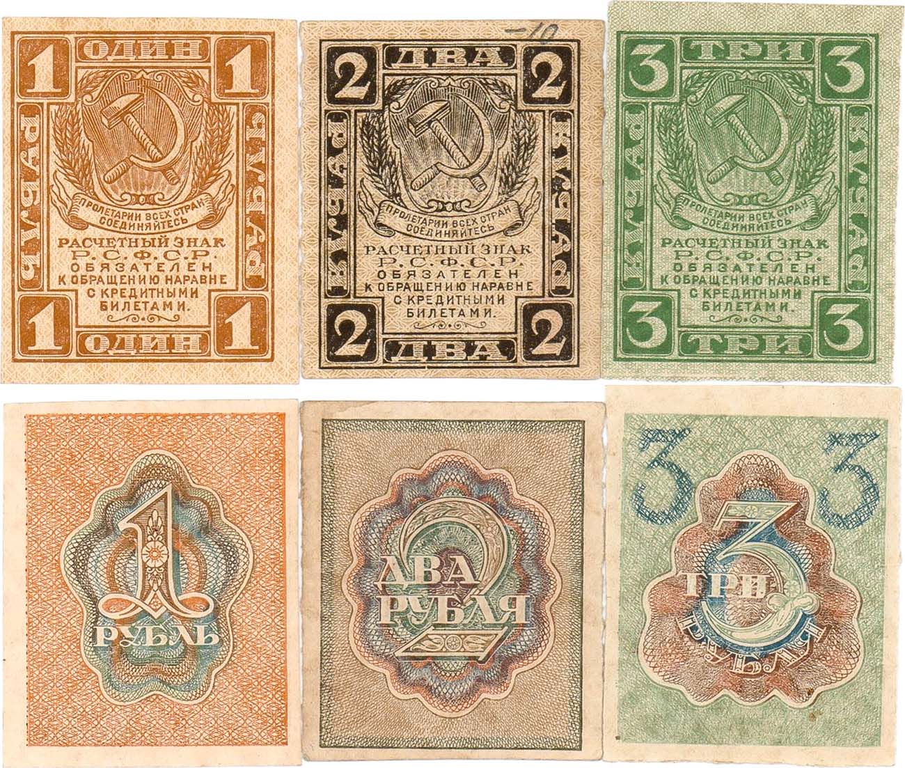 РСФСР. Расчётный знак. 1 рубль образца 1919 года. Водяной знак-"Теневые квадраты". ZG2 №2.2.1. UNC. РСФСР. Расчётный знак. 2 рубля образца 1919 года. Водяной знак-"Теневые квадраты". ZG2 № 2.2.3. AU. РСФСР. Расчётный знак. 3 рубля образца 1919 года. Водяной знак-"Теневые квадраты". ZG2 №2.2.5. AU. AU/UNC.