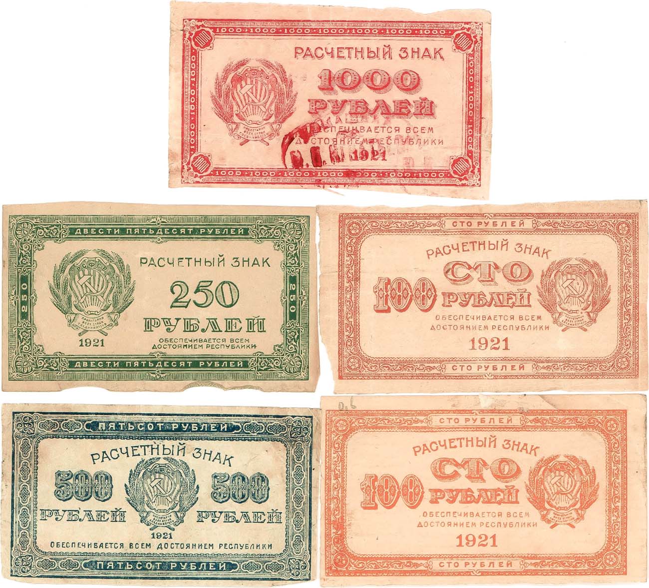 1000 рублей 1921 года. В/з 3. ZG2.№2.6.17. 500 рублей 1921 года. В/з 3. ZG2.№2.6.11. 250 рублей 1921 года. В/з 6. ZG2.№2.6.5. 100 рублей 1921 года. Коричневые. ZG2.№2.6.1. 100 рублей 1921 года. Лимонные. ZG2.№2.6.3. XF-/AU.