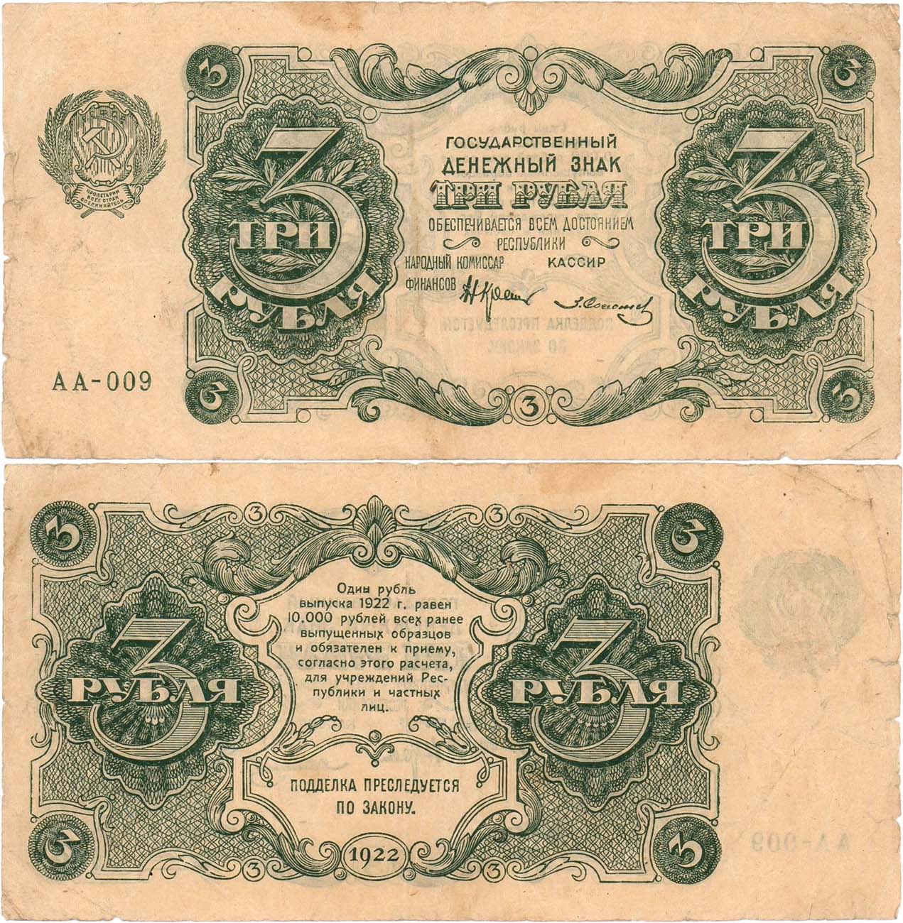 Серия АА-009. Подписи: Крестинский/З. Солонинин. ZG2№2.7.2. VF.