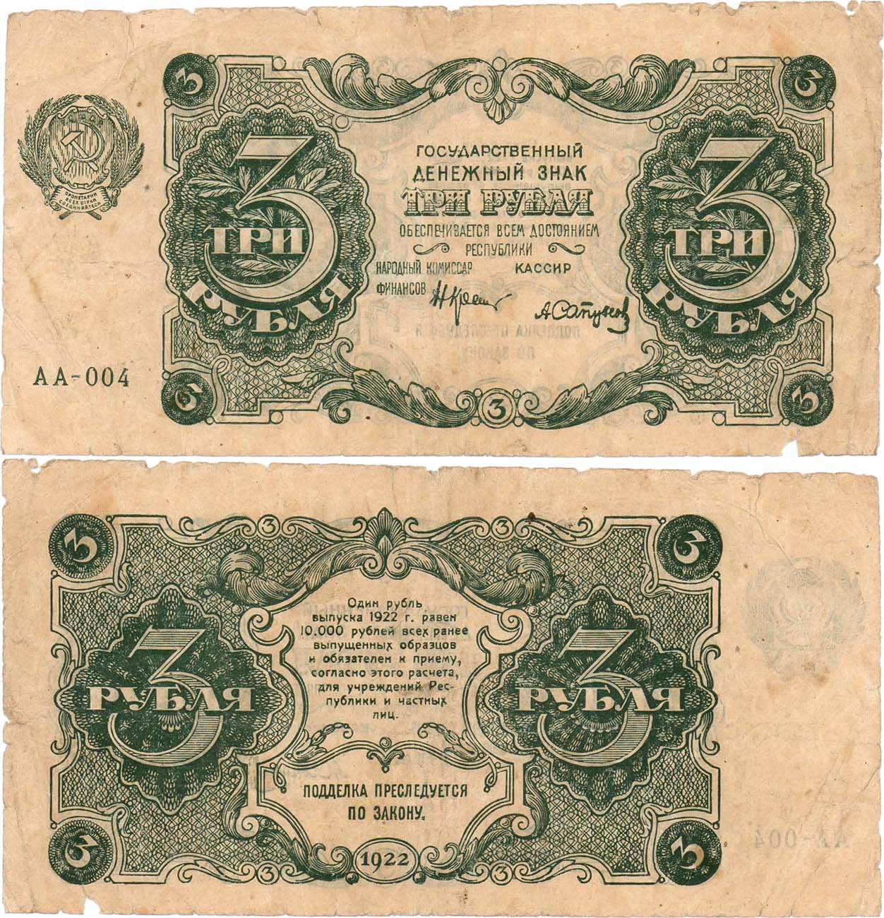 Серия АА-004. Подписи: Крестинский/Сапунов. ZG2№2.7.2. F/VF.
