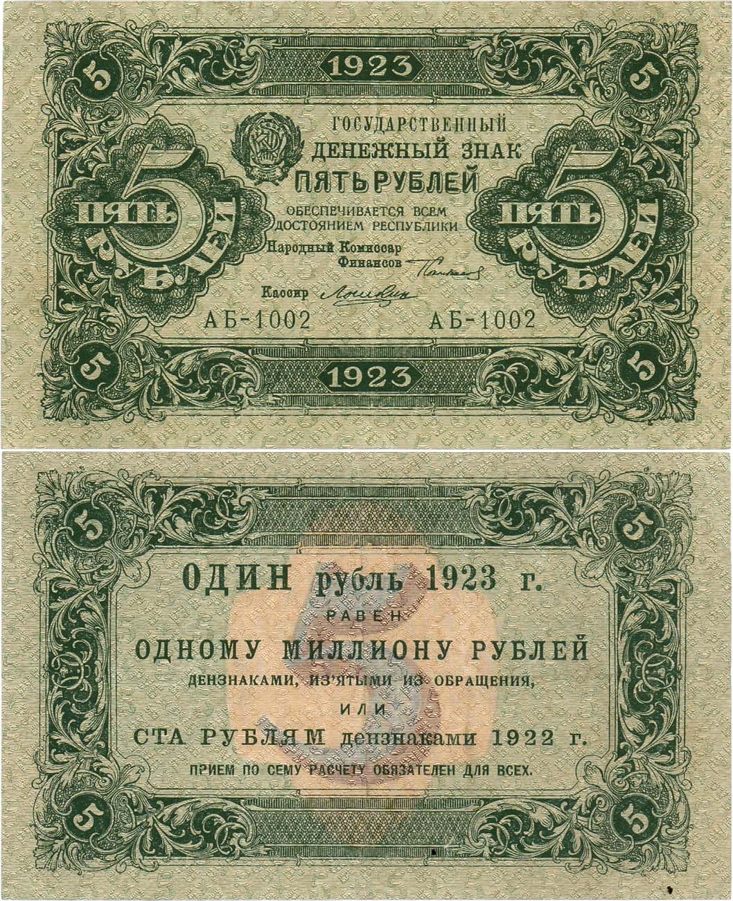 Серия АБ-1002. Водяной знак: "Теневые квадраты". Подписи: Сокольников/Лошкин. ZG2 №2.9.5. XF.