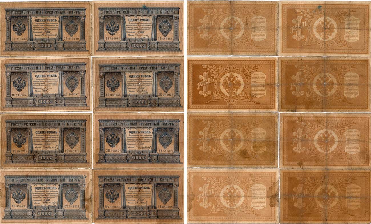 1 рубль 1898 года. Серия АС 248947. Подписи Плеске/Брут. ZG2.№1.14.1. 1 рубль 1898 года. Серия ВЪ 859668. Подписи Шипов/Барышев. ZG2.№1.17.2. 1 рубль 1898 года. Серия ЗИ 578627. Подписи Шипов/Чихиржин. ZG2.№1.17.9. 1 рубль 1898 года. Серия ЗЗ 213432. Подписи Шипов/Афанасьев. ZG2.№1.17.1. 1 рубль 1898 года. Серия ЕЧ 032831. Подписи Шипов/Морозов. ZG2.№1.17.6. 1 рубль 1898 года. Серия ЗЪ 880718. Подписи Шипов/Сафронов. ZG2.№1.17.8. 1 рубль 1898 года. Серия ДЭ 446066. Подписи Шипов/Овчинников. ZG2.№1.17.7. F/XF.