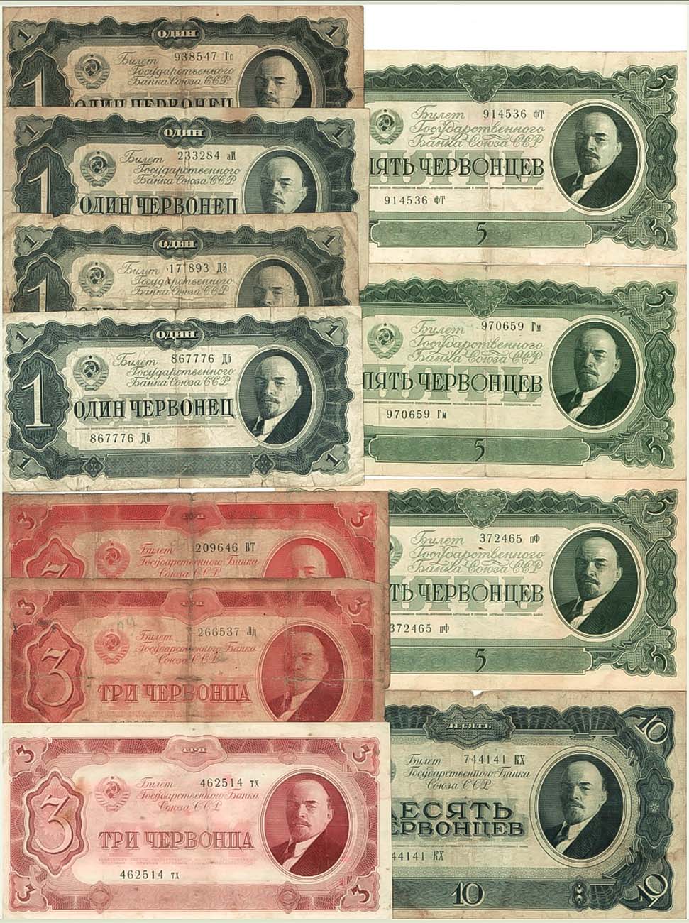 10 червонцев 1937 года. Серия КХ 744141. VF. 5 червонцев 1937 года. Серия пФ 372465. XF. 5 червонцев 1937 года. Серия Гм 970659. VF. 5 червонцев 1937 года. Серия фТ 914536. VF. 3 червонца 1937 года. Серия ВТ 209646. F. 3 червонца 1937 года. Серия Лд 266537. G-F. 3 червонца 1937 года. Серия тх 462514. VF. 1 червонец 1937 года. Серия ДЗ 177893. VF-. 1 червонец 1937 года. Серия аИ 233284. VF-. 1 червонец 1937 года. Серия Гс 938547. F-. 1 червонец 1937 года. Серия Дб 867776. F. G/XF.