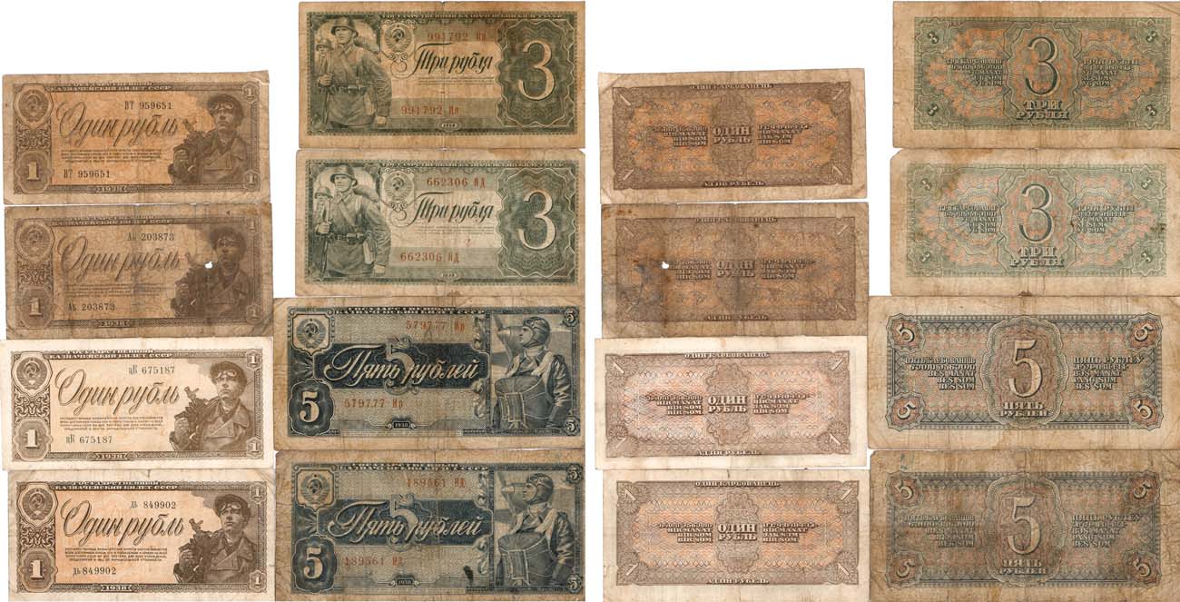 1 рубль 1938 года. Серии: цК, дь, Аь, ВТ. 3 рубля 1938 года. Серии: ЯД, Ия. 5 рублей 1938 года. Серии: ИД, Нр. F/VF.