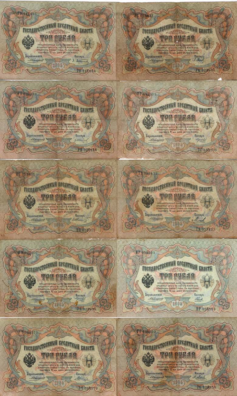 Государственный кредитный билет. 3 рубля 1905 года. Серия ТО 428659. Коншин/Метц. ZG2.№1.16.29. VF. Государственный кредитный билет. 3 рубля 1905 года. Серия УЧ 360570. Коншин/Шагин. Редкий кассир. ZG2.№1.16.37. VF. Государственный кредитный билет. 3 рубля 1905 года. Серия ТО 111886. Коншин/Афанасьев. ZG2.№1.16.21. VF. Государственный кредитный билет. 3 рубля 1905 года. Серия УК 623833. Коншин/Барышев. ZG2.№1.16.22. F/VF. Государственный кредитный билет. 3 рубля 1905 года. Серия УН 320188. Коншин/Иванов. ZG2.№1.16.27. VF. Государственный кредитный билет. 3 рубля 1905 года. Серия ТГ 442308. Коншин/Морозов. ZG2.№1.16.31. F/VF. Государственный кредитный билет. 3 рубля 1905 года. Серия ПП 651371. Коншин/Шмидт. ZG2.№1.16.38. F/VF. Государственный кредитный билет. 3 рубля 1905 года. Серия ТА 057433. Коншин/Михеев. ZG2.№1.16.30. VF. Государственный кредитный билет. 3 рубля 1905 года. Серия ОЯ 923906. Коншин/Морозов. ZG2.№1.16.31. VF. Государственный кредитный билет. 3 рубля 1905 года. Серия НР 959503. Коншин/Наумов. ZG2.№1.16.32. VF/XF. F/XF.