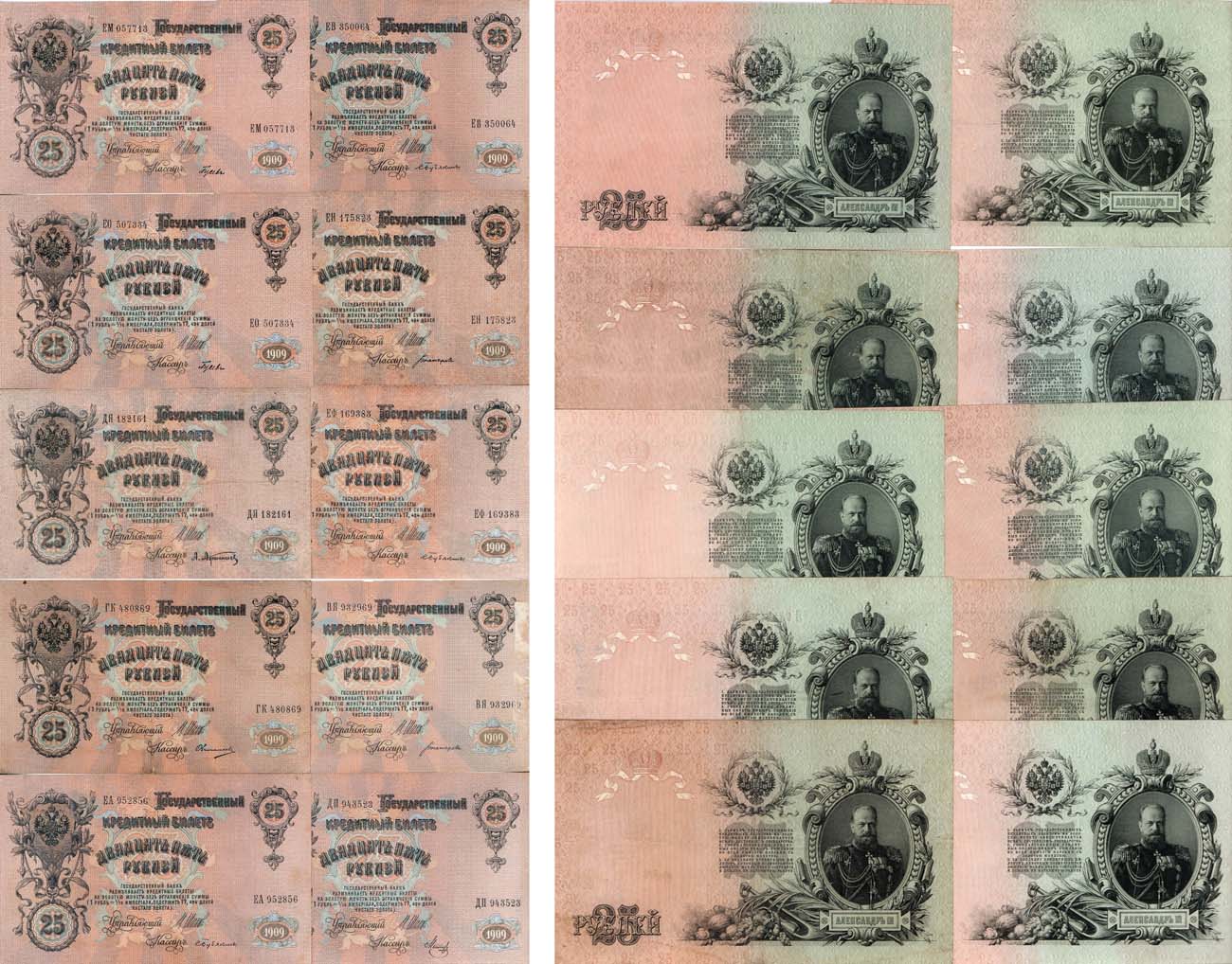 Государственный кредитный билет. 25 рублей 1909 года. Царский выпуск (1914-1917). Серия ВЯ 932969. Подписи: Шипов/Богатырёв. ZG2№1.17.22. VF/XF. Государственный кредитный билет. 25 рублей 1909 года. Царский выпуск (1914-1917). Серия ГК 480869. Подписи: Шипов/Овчинников. ZG2№1.17.22. VF/XF. Государственный кредитный билет. 25 рублей 1909 года. Выпуск временного правительства. Серия ДП 943523. Подписи: Шипов/Метц. ZG2№1.17.23. XF+. Государственный кредитный билет. 25 рублей 1909 года. Советский выпуск (1917-1921). Серия ЕА 952856. Подписи: Шипов/Бубякин. ZG2№1.17.24. VF/XF. Государственный кредитный билет. 25 рублей 1909 года. Советский выпуск (1917-1921). Серия ЕВ 350064. Подписи: Шипов/Бубякин. ZG2№1.17.24. XF. Государственный кредитный билет. 25 рублей 1909 года. Советский выпуск (1917-1921). Серия ЕМ 057713. Подписи: Шипов/Гусев. ZG2№1.17.24. XF. Государственный кредитный билет. 25 рублей 1909 года. Советский выпуск (1917-1921). Серия ЕН 175823. Подписи: Шипов/Богатырев. ZG2№1.17.24. VF. Государственный кредитный билет. 25 рублей 1909 года. Советский выпуск (1917-1921). Серия ЕО 507334. Подписи: Шипов/Гусев. ZG2№1.17.24. XF/aUNC. Государственный кредитный билет. 25 рублей 1909 года. Советский выпуск (1917-1921). Серия ЕФ 169383. Подписи: Шипов/Бубякин. ZG2№1.17.24. XF. Государственный кредитный билет. 25 рублей 1909 года. Советский выпуск (1917-1921). Серия ДЯ 182161. Подписи: Шипов/Афанасьев. ZG2№1.17.24. VF. VF/aUNC.