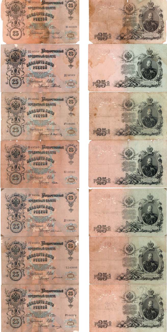 25 рублей 1909 года. Подписи: Коншин/Афанасьев. ZG2.№1.16.85. 25 рублей 1909 года. Подписи: Коншин/Чихиржин. ZG2.№1.16.104. 25 рублей 1909 года. Подписи: Шипов/Родионов. ZG2.№1.17.23. 25 рублей 1909 года. Подписи: Шипов/Гусев. ZG2.№1.17.23. 25 рублей 1909 года. Подписи: Шипов/Бубякин. ZG2.№1.17.23. 25 рублей 1909 года. Подписи: Шипов/Богатырев. ZG2.№1.17.22. 25 рублей 1909 года. Подписи: Шипов/Овчинников. ZG2.№1.17.22. F/XF-.