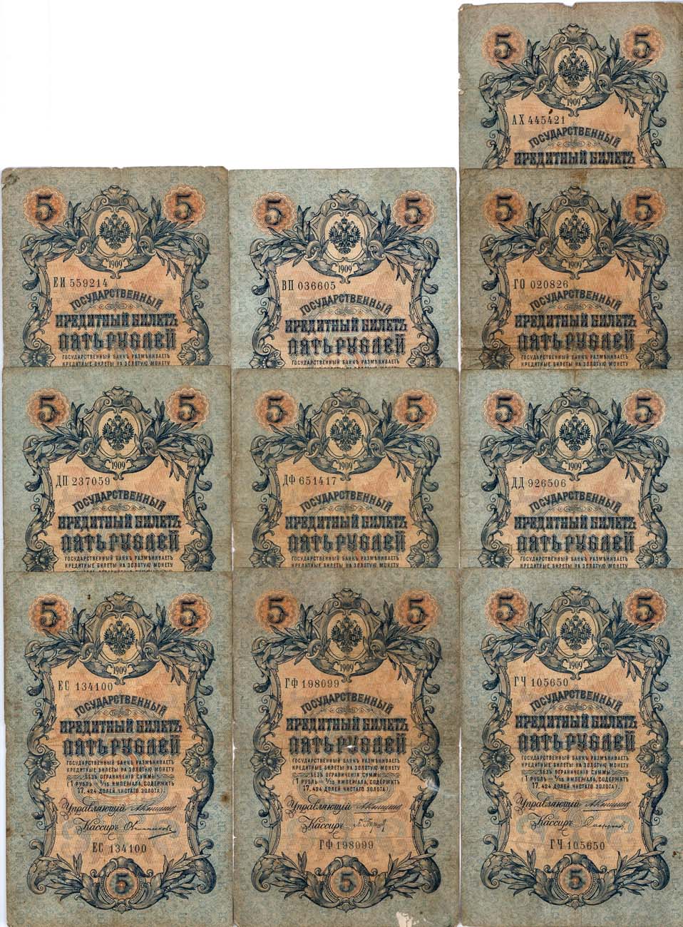 Государственный кредитный билет. 5 рублей 1909 года. Серия ВП 036605. Коншин/Гаврилов. ZG2.1.16.46. VF. Государственный кредитный билет. 5 рублей 1909 года. Серия ГО 020826. Коншин/Гр. Иванов. ZG2.1.16.50. VF-. Государственный кредитный билет. 5 рублей 1909 года. Серия ДП 237059. Коншин/Наумов. ZG2.1.16.56. VF-. Государственный кредитный билет. 5 рублей 1909 года. Серия ДФ 651417. Коншин/Овчинников. ZG2.1.16.57. VF-. Государственный кредитный билет. 5 рублей 1909 года. Серия ДД 926506. Коншин/Чихиржин. ZG2.1.16.63. VF-. Государственный кредитный билет. 5 рублей 1909 года. Серия АХ 445421. Коншин/Стариков. ZG2.1.16.60. F. Государственный кредитный билет. 5 рублей 1909 года. Серия ЕИ 559214. Коншин/Афанасьев. ZG2.1.16.39. F/VF-. Государственный кредитный билет. 5 рублей 1909 года. Серия ЕС 134100. Коншин/Овчинников. ZG2.1.16.57. VF-. Государственный кредитный билет. 5 рублей 1909 года. Серия ГЧ 105650. Коншин/Стариков. ZG2.1.16.60. F/VF-. Государственный кредитный билет. 5 рублей 1909 года. Серия ГФ 198099. Коншин/Барышев. ZG2.1.16.40. F. F/VF.