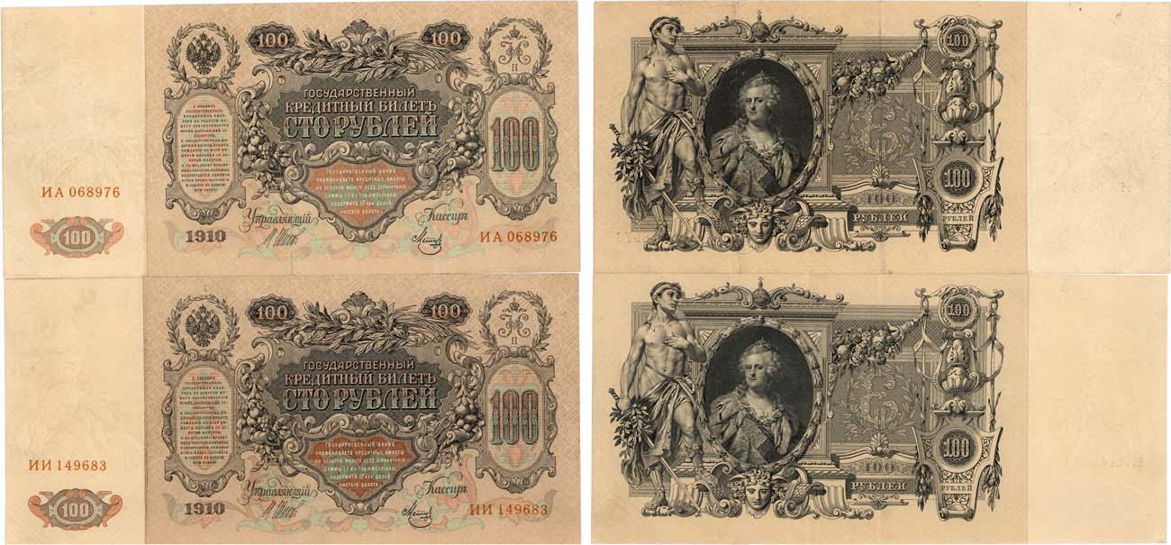 Государственный кредитный билет. 100 рублей 1910 года. Управляющий Шипов, кассир Метц. Серия ИИ №149683. Временное правительство. ZG2. №1.17.26. XF. Государственный кредитный билет. 100 рублей 1910 года. Управляющий Шипов, кассир Метц. Серия ИА №068976. Временное правительство. ZG2. №1.17.26. VF/XF. VF/XF.