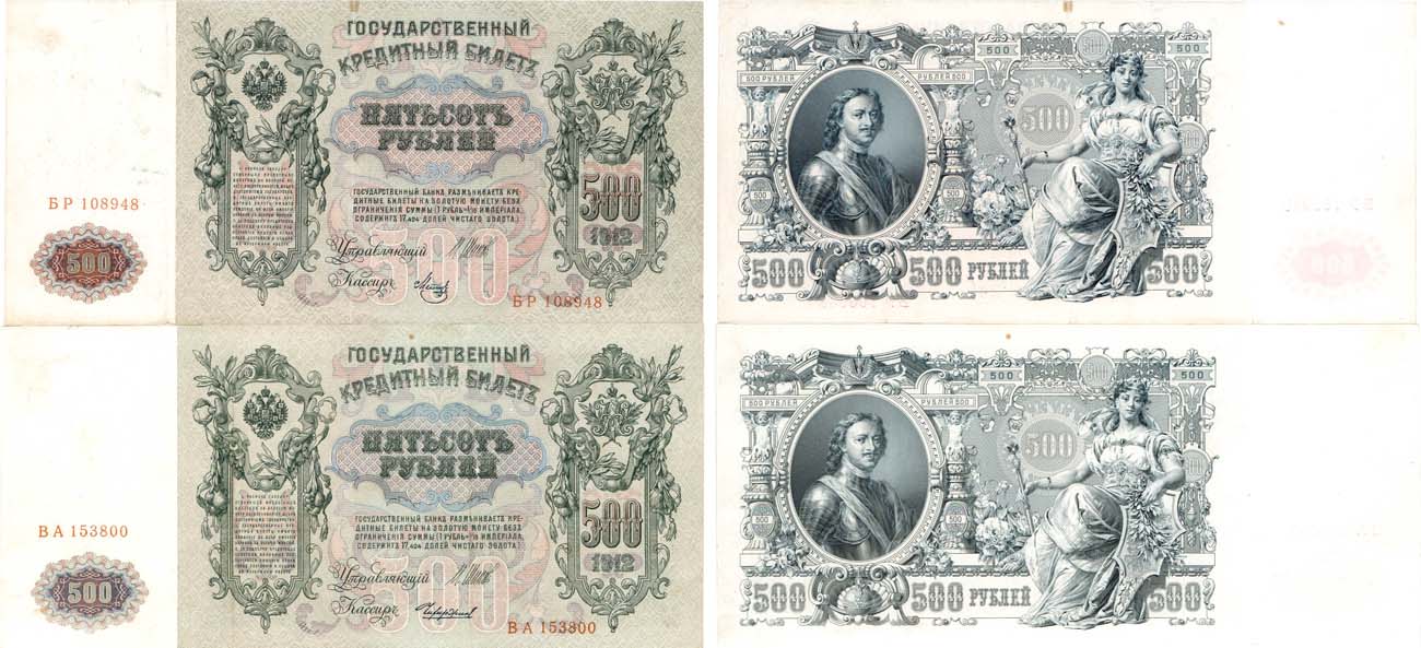 Государственный кредитный билет. 500 рублей 1912 года. Управляющий Шипов, кассир Метц. Серия БР №108948. Советский выпуск. ZG2. №1.17.30. VF/XF. Государственный кредитный билет. 500 рублей 1912 года. Управляющий Шипов, кассир Чихиржин. Серия ВА №153800. Советский выпуск. ZG2. №1.17.30. VF/XF. VF/XF.
