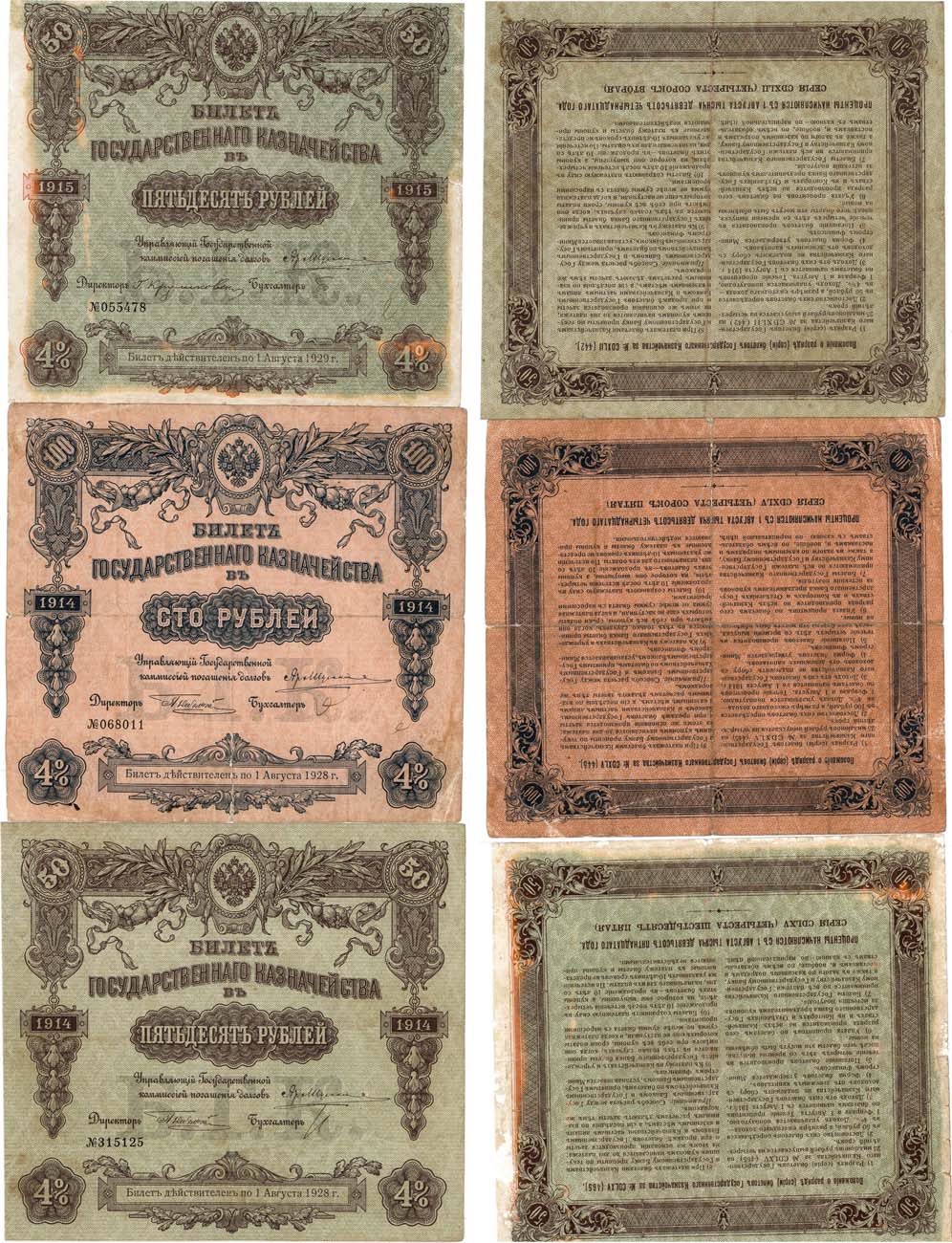 100 рублей 1914 года. №068011. Серия 445. ZG2.№4.16.4. 50 рублей 1914 года. №315125. Серия 442. ZG2.№4.16.2. 50 рублей 1914 года. №055478. Серия 465. ZG2.№4.16.3. VF-/XF-.