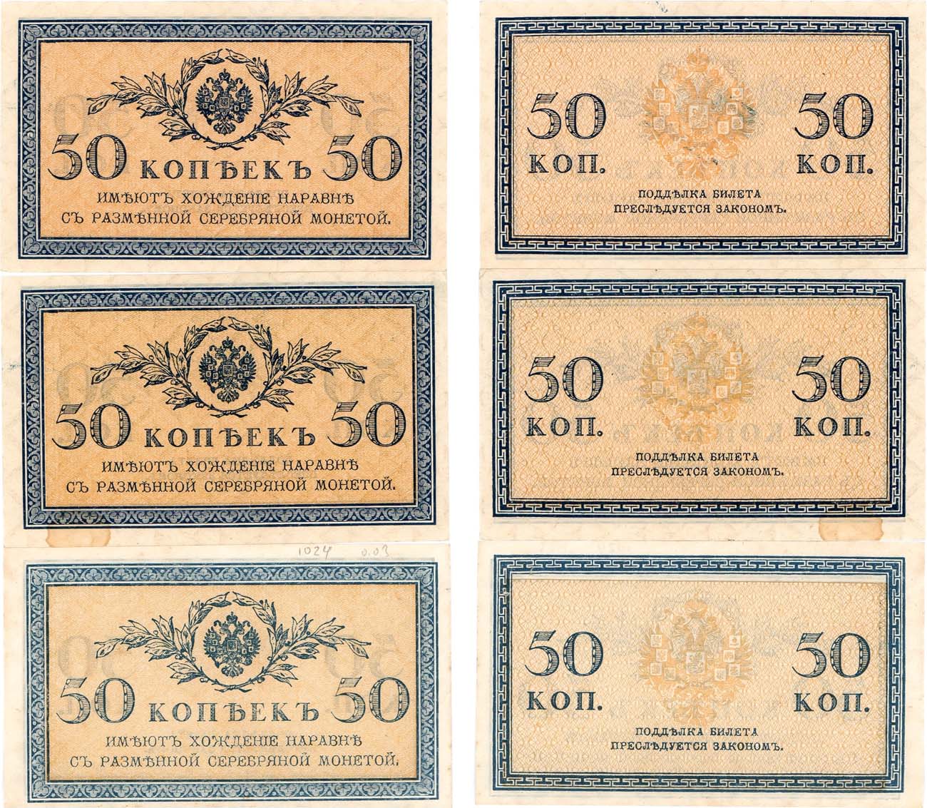 Лот из 3 бон Российской империи по 50 копеек 1915 года.
