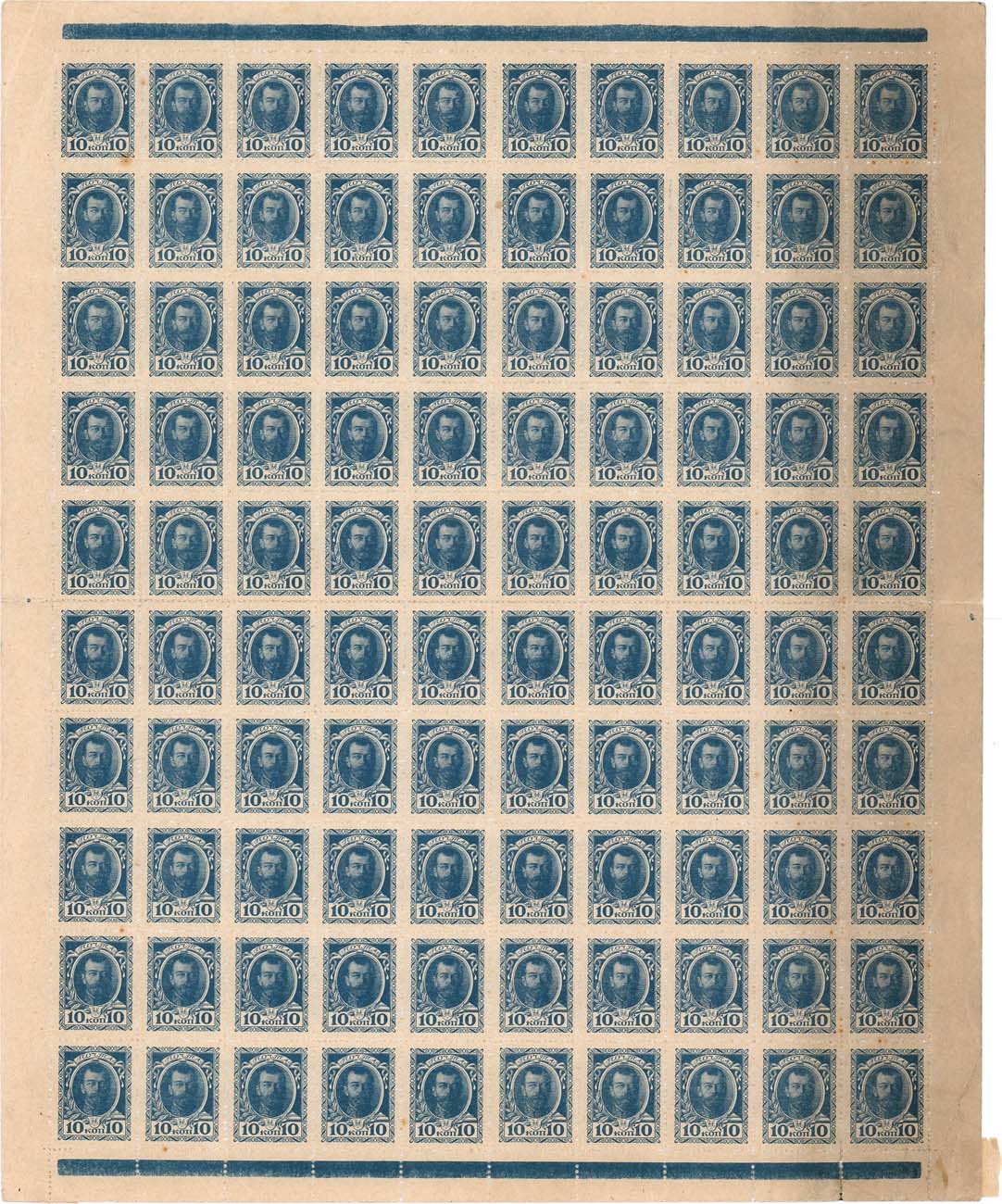 Российская империя. Разменные деньги-марки номиналом 10 копеек (1915) года. 100 штук (10х10 штук). Полный лист.