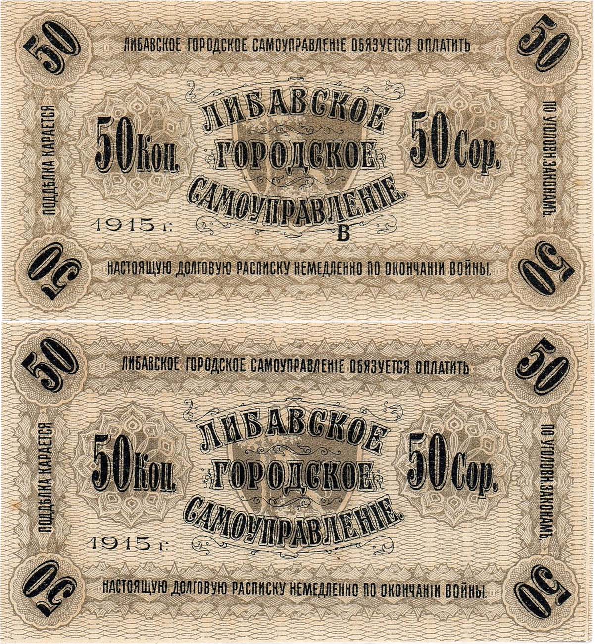 Российская Империя. Либава (Лиепая), Курляндской губернии. Либавское Городское самоуправление. Долговая расписка. 50 копеек 1915 года. Серия В. Не выпущена.