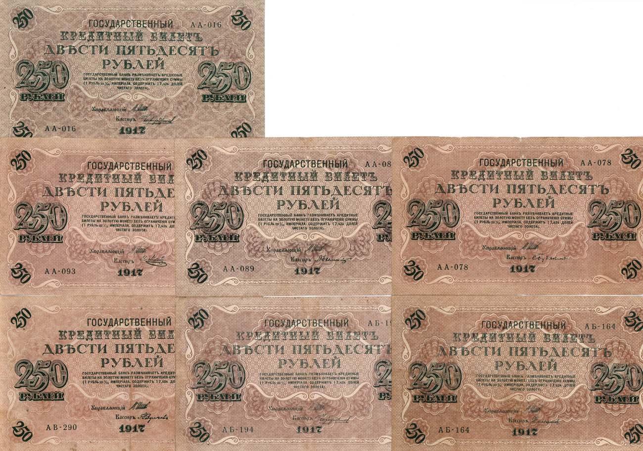 Временное правительство. Государственный Кредитный билет. 250 рублей 1917 года. Серия АА-016. Шипов/Чихиржин. ZG2 №1.22.1. XF. Советское правительство. Государственный Кредитный билет. 250 рублей 1917 года. Серия АА-078. Шипов/Бубякин. ZG2 №1.22.2. VF. Советское правительство. Государственный Кредитный билет. 250 рублей 1917 года. Серия АА-089. Шипов/Былинский. ZG2 №1.22.2. VF/XF. Советское правительство. Государственный Кредитный билет. 250 рублей 1917 года. Серия АА-093. Шипов/Метц. ZG2 №1.22.2. VF. Советское правительство. Государственный Кредитный билет. 250 рублей 1917 года. Серия АБ-164. Шипов/Софронов. ZG2 №1.22.2. VF. Советское правительство. Государственный Кредитный билет. 250 рублей 1917 года. Серия АБ-194. Шипов/Чихиржин. ZG2 №1.22.2. VF. Советское правительство. Государственный Кредитный билет. 250 рублей 1917 года. Серия АВ-290. Шипов/Федулеев. ZG2 №1.22.2. VF-. VF/XF.