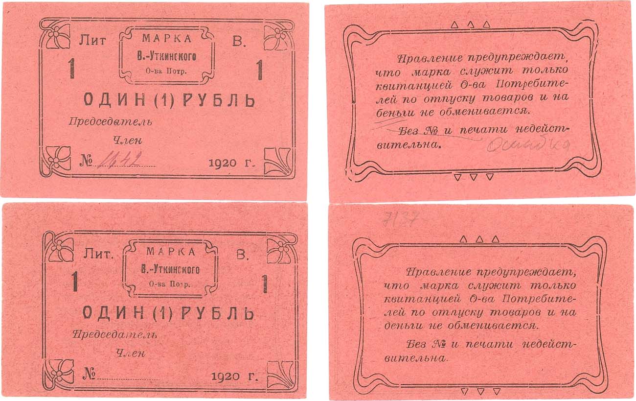 2 марки по 1 рублю 1920 года. Одна с опечаткой. Висимо-Уткинское Общество Потребителей. Рябченко №17902р (1д), с опечаткой "беньги" на оборотной стороне Рябченко №17903р (3д). UNC-.