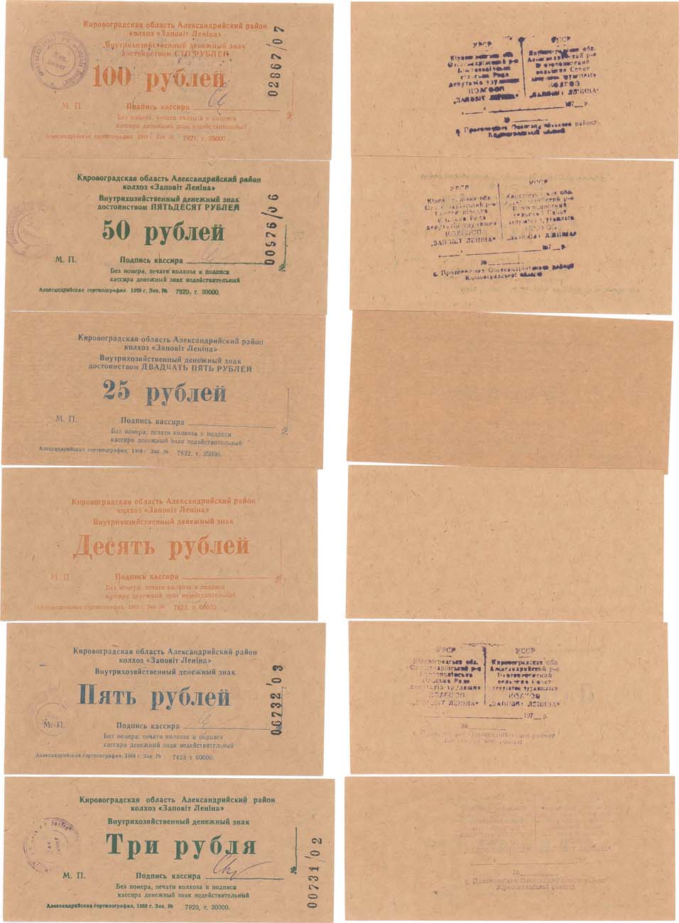 Внитрихозяйственный денежный знак 3, 5, 10, 25, 50 и 100 рублей 1989 года UNC.