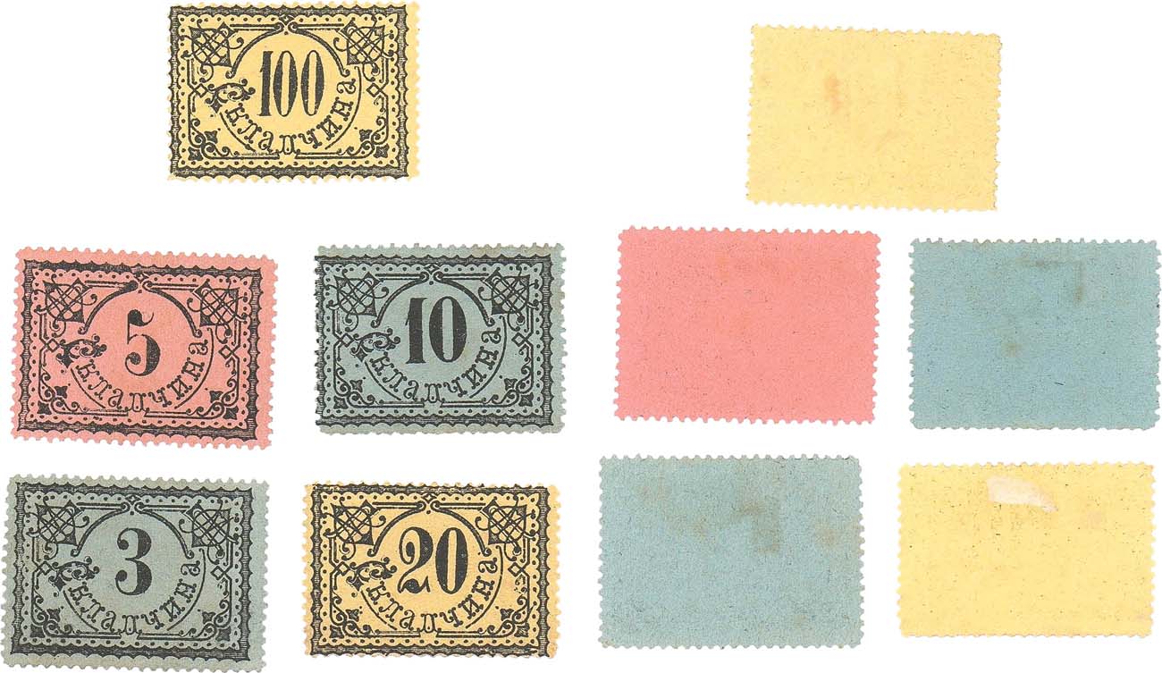 Московское Потребительское общество "Складчина" (МПО-МПС). 3, 5, 10, 20 и 100 единиц 1920 года. Тип цветной почтовой марки с перфорацией. Без названия единиц. Рябченко №№8528р-8532р (по 2д). UNC-.