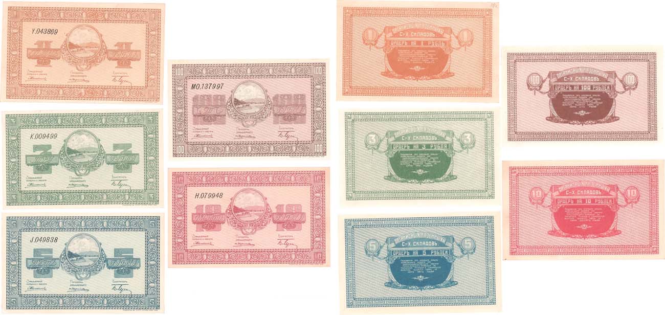 Ордер на 1, 3, 5, 10 и 100 рублей 1919 года. Переселенческое управление. Организация казенных сельско-хозяйственных складов. Рябченко №№ 5990р (10д), 5991р (8д), 5992р (8д), 5993р (10д), 5996р (10д). aUNC/UNC.