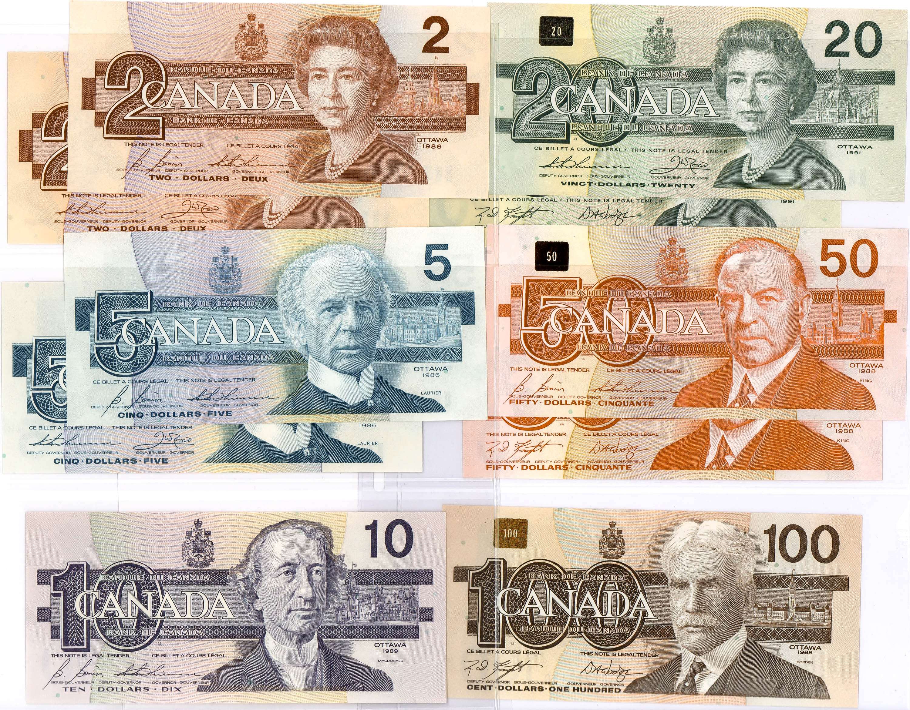 1 доллар 1954 года. Оттава. Подписи: Beattie-Coyne. Pick 66b. UNC. 1 доллар 1954 года. Модификация. Оттава. Подписи: Beattie-Rasminsky. Pick 74b. UNC. 1 доллар 1954 года. Модификация. Оттава. Подписи: Lawson-Bouey. Pick 75d. UNC. 1 доллар 1967 года. 100 лет конфедерации 1867-1967. Оттава. Подписи: Beattie-Rasminsky.. Pick 84a. UNC. 1 доллар 1967 года. Оттава. Подписи: Beattie-Rasminsky.. Pick 84b. UNC. 2 доллара 1954 года. Оттава. Подписи: Beattie-Rasminsky. Pick 76с. UNC. 5 долларов 1954 года. Оттава. Подписи: Beattie-Rasminsky. Pick 77с. UNC. 10 долларов 1954 года. Оттава. Подписи: Beattie-Rasminsky. Pick 79b. UNC. 20 долларов 1954 года. Оттава. Подписи: Beattie-Rasminsky. Pick 80b. UNC. 50 долларов 1954 года. Оттава. Подписи: Beattie-Coyne. Pick 81а. UNC. 100 долларов 1954 года. Оттава. Подписи: Lawson-Bouey. Pick 82с. UNC. 1 доллар 1973 года. Оттава. Pick 85a. 85c. UNC. 2 доллара 1974 года. Оттава. Pick 86a. 86b.UNC. 5 долларов 1972 года. Оттава. Pick 87a. 87b. UNC. 10 долларов 1971 года. Оттава. PIck 88c. UNC. 20 долларов 1969 года. Оттава. Pick 89b. UNC. 50 долларов 1975 года. оттава. Pick 90a. UNC. 100 долларов 1975 года. Оттава. Pick 91b. UNC. 5 долларов 1979 года. Оттава. Pick 92a, 92b. UNC. 20 долларов 1979 года. Оттава. Pick 93a, 93b. UNC. 2 доллара 1986 года. оттава. Pick 94b, 94c. UNC. 5 долларов 1986 года. Оттава. Pick 95b, 95c. UNC. 10 долларов 1986 года. Оттава. Pick 96b. UNC. 20 долларов 1991 года. Оттава. Pick 97a, 97d. UNC. 50 долларов 1988 года. Оттава. Pick 98b, 98d. UNC. 100 долларов 1988 года. Оттава. Pick 99d. UNC. 5 долларов 2002 года. Pick 101a. UNC. 5 долларов 2006 года. Модификация. Pick 101Aa. UNC. 5 долларов 2013 года. Macklem, S.S. Poloz. Pick 106. UNC. 10 долларов 2001 года. Pick 102b. UNC. 10 долларов 2005 года. Модификация. Pick 102Ab. UNC. 10 долларов 2013 года. Macklem, Carney. Pick NEW. UNC. 20 долларов 2004 года. Pick 103a. UNC. 50 долларов 2004 года. PIck 104a. UNC. 100 долларов 2004 года. Pick 105a. UNC. 20 долларов 2012 года. Pick NEW.UNC. 50 долларов 2012 года. Pick NEW. UNC. 100 долларов 2011 года. Pick NEW. UNC. 20 долларов 2015 года. Памятный выпуск 2015 года. Pick NEW. UNC. 10 долларов 2017 года. Празднование 150-летия Канады 1867 - 2017 гг. Pick NEW. UNC. 10 долларов 2018 года. Виола Дезмонд. Pick NEW. UNC. UNC.