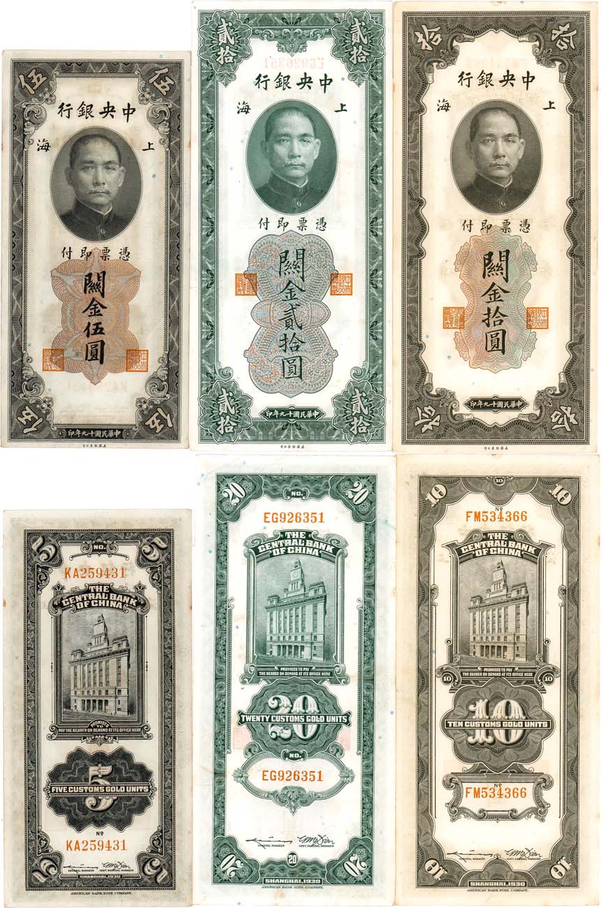 5 золотых таможенных юнитов 1930 года. Серия КА №259431. Выпуск AMERICAN BANK NOTE COMPANY. Pick 326d. XF/AU. 10 золотых таможенных юнитов 1930 года. Серия FM №534366. Выпуск AMERICAN BANK NOTE COMPANY. Pick 327d. XF/AU. 20 золотых таможенных юнитов 1930 года. Серия FM №534366. Выпуск AMERICAN BANK NOTE COMPANY. Pick 328. XF/AU. XF/AU.