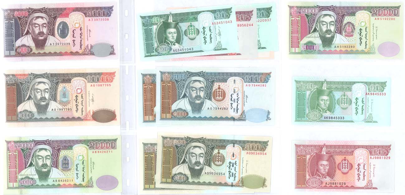Выпуск 1955 года: 1, 3, 5, 10, 25, 50, 100 тугриков (Pick 28, 29, 30, 31, 32, 33, 34). Дамдин Сухэ-Батор. aUNC-UNC. Выпуск 1966 года: 1, 3, 5, 10, 25, 50, 100 тугриков (Pick 35, 36, 37, 38, 39, 40). Дамдин Сухэ-Батор. UNC. Выпуск 1981-1983 гг: 1 тугрик 1983 года. Pick 42. UNC. Выпуск 1993 года: 10, 20, 50 менге, 1, 1, 5, 5, 10, 50, 50 тугриков (Pick 52, 53, 54, 56, 56). Дамдин Сухэ-Батор. UNC. Выпуск 2000-2020 гг: 50, 100, 100 тугриков 2000, 10, 10, 20, 20 тугриков 2002 года, Выпуск. 500, 1000, 5000 тугриков 2003 года. 20000 тугриков 2006 года, Выпуск. 1, 5, 50, 100 тугриков 2008 года, 10, 20, 10000 тугриков 2009 года, Выпуск. 10, 20, 50, 500, 1000, 20000 тугриков 2013 года, Выпуск. 10, 20 тугриков 2014 года(Pick 61Aa, 61Ba, 62b, 62e, 62g, 62h, 63b, 63e, 63g, 63h, 64a, 64b, 64e, 65a, 65b, 66a, 66d, 67a, 67d, 68a, 69b, 70a, 71b). UNC. AU/UNC.