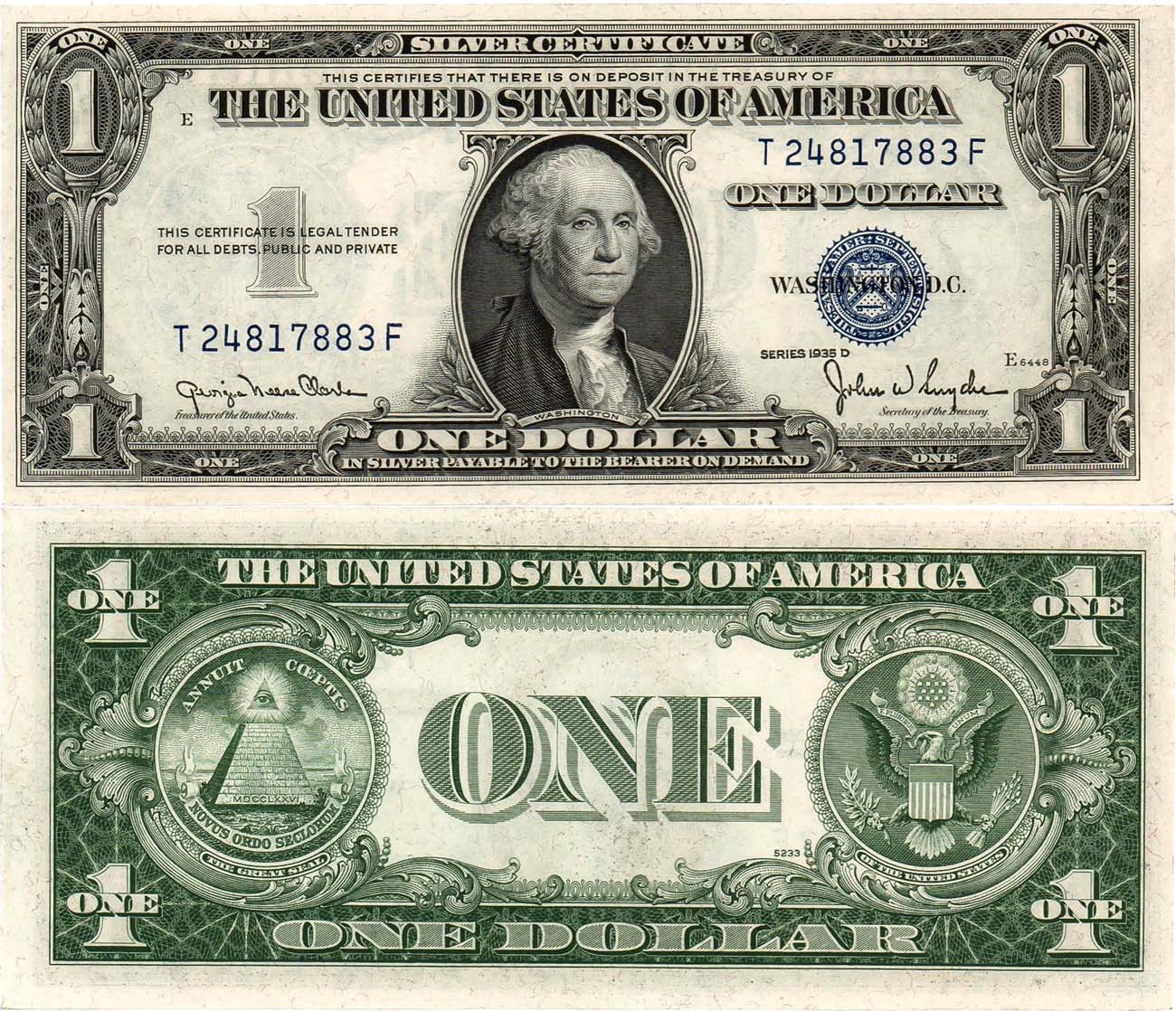 Подписи: Clark & Snyder. президент Джордж Вашингтон. Серебряный сертификат, Серия 1935 D, синие номера №T24817883F. широкий дизайн реверса. Pick 416D1. AU.
