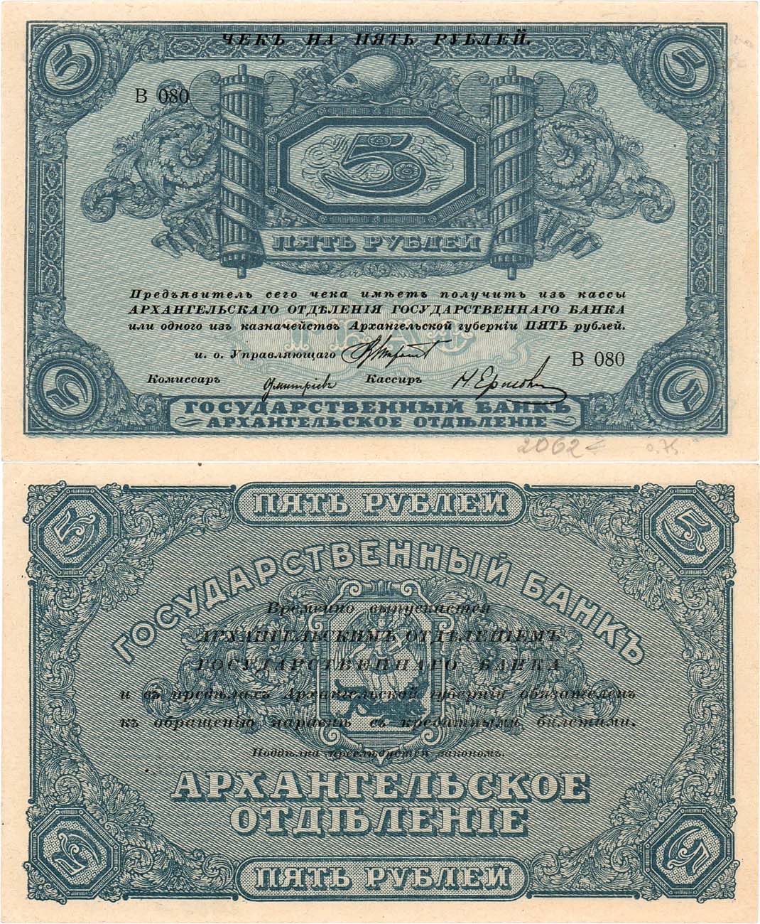 Серия В 080. Кардаков II.1.2 (3 дойчмарки). Чек достоинством 5 рублей был напечатан достаточно большим тиражом, но по неясным до сих пор причинам в Архангельск так и не был отправлен и в обращение не поступал. UNC-.