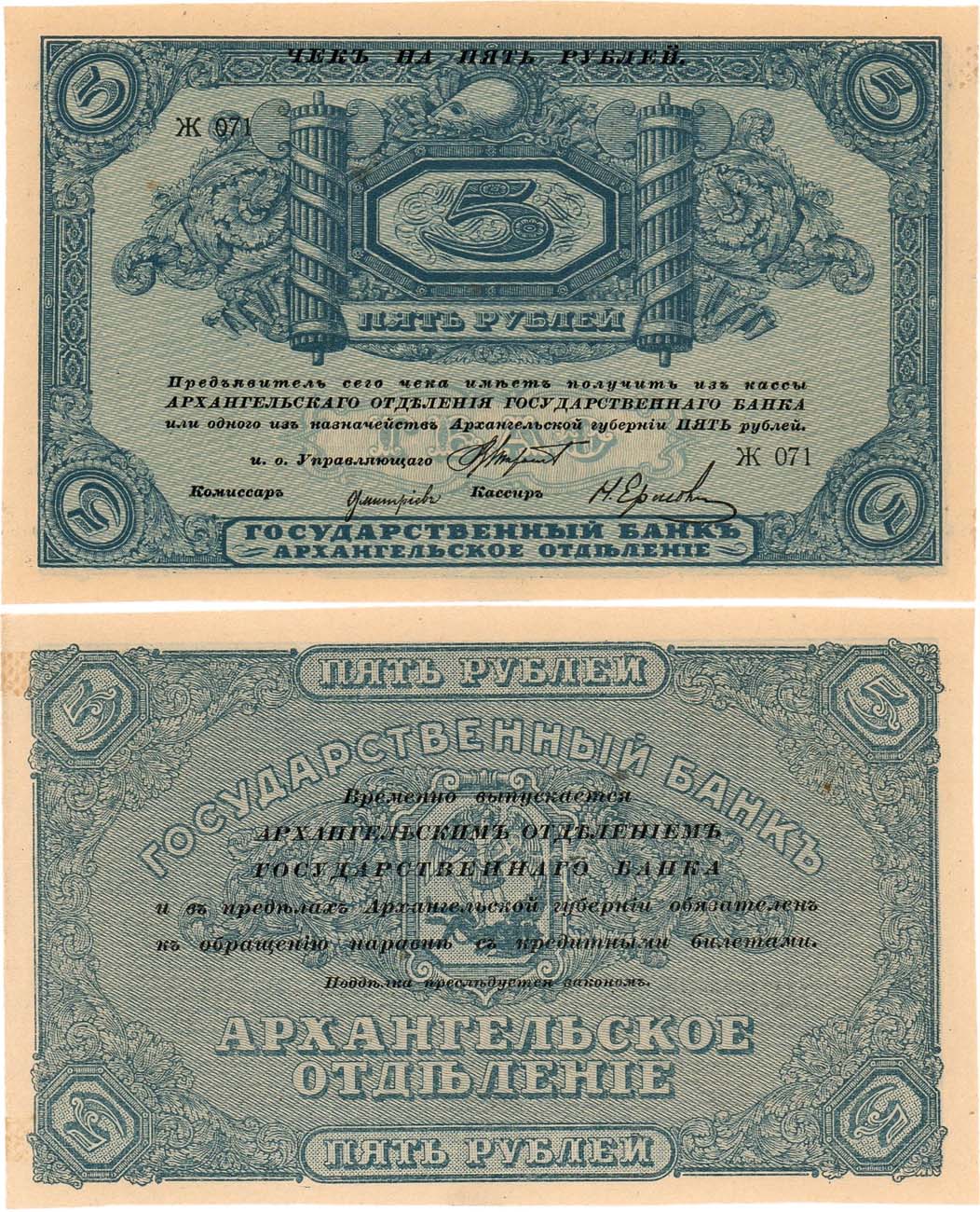 Чек достоинством 5 рублей был напечатан достаточно большим тиражом, но по неясным до сих пор причинам в Архангельск так и не был отправлен и в обращение не поступал.