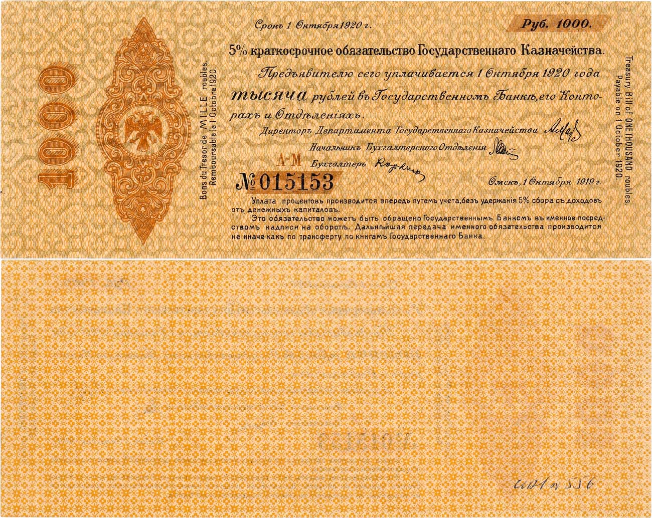 Срок - 1 октября 1920 года. Серия А-М №015153. Водяной знак "сетчатка". Подпись: Директор Отдела Государственного Казначейства - А.П. Мальцев. Кардаков XI.50.7. Истомин 340.3.1. aUNC.