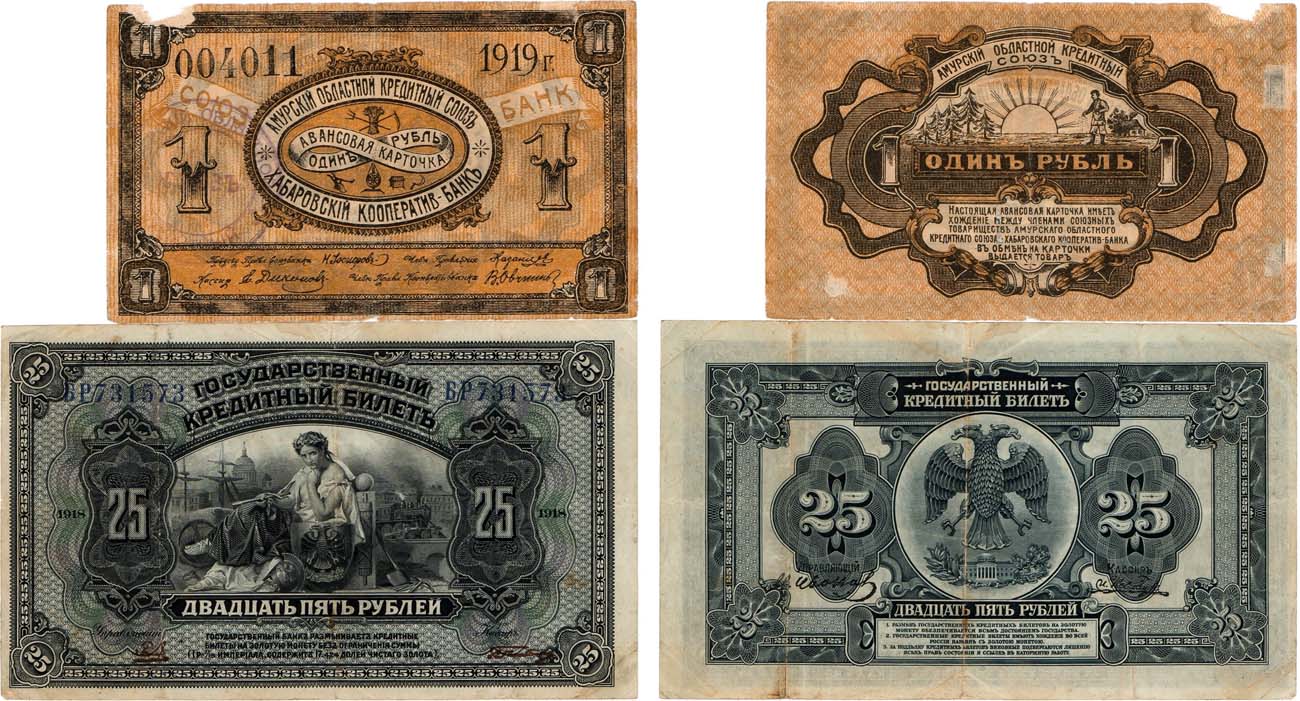 Временное Правительство Дальнего Востока. Государственный кредитный билет. 25 рублей образца 1918 года. Выпуск 1920г. Кардаков XI.10.8. Истомин Е340.N2.1. Хабаровск. Амурский Областной Кредитный Союз. Авансовая Карточка. 1 рубль 1919 года. Печать Амурского союза. Кардаков XI.31.85. Истомин F3525.1.1a. VF/XF.