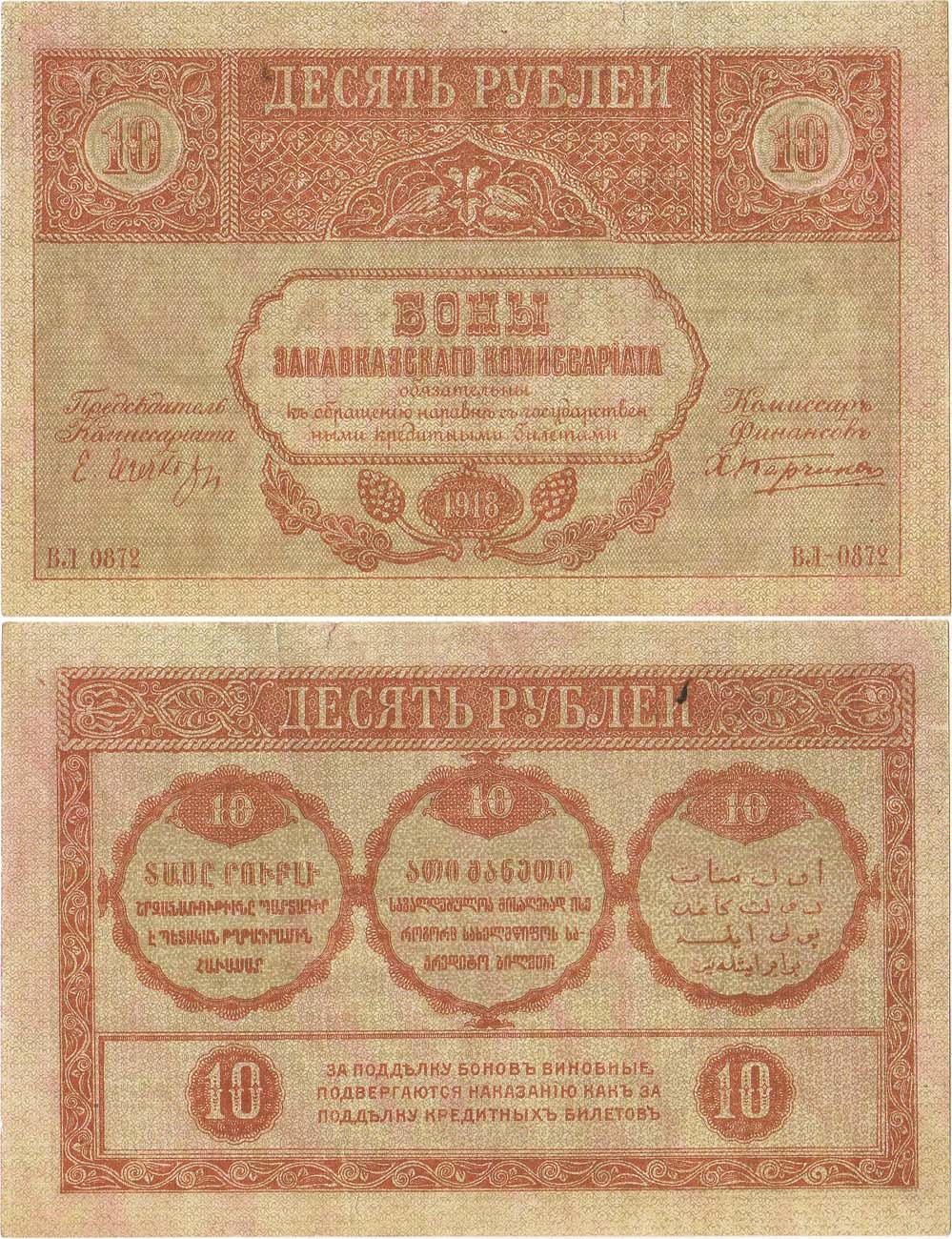 Правительство с названием "Закавказский комиссариат" было образовано 15 ноября 1917 года. Под его юрисдикцию попали все пять губерний Закавказья, председателем был избран Е. Гегечкори. В феврале 1918 года при Комиссариате был создан Закавказский Сейм, наделенный законодательными правами. Но уже в мае 1918 года Сейм сложил с себя полномочия и объявил о распаде Закавказья. Сразу же после этого решения были образованы самостоятельные Грузинская, Азербайджанская и Армянская республики. Боны Закавказского комиссариата выпускались Тифлисской конторой Госбанка с 9 февраля 1918 года по сентябрь 1919 года, хотя сам Комиссариат перестал существовать в мае 1918 года. По мере выпуска Закавказскими республиками своих денежных эмиссий, в период 1919-1924 годов, боны Комиссариата постепенно обменивались на новые республиканские знаки и выходили из обращения.