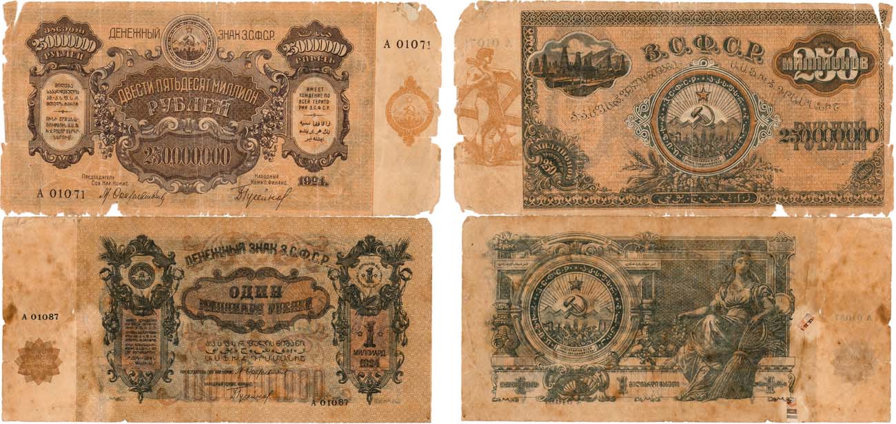 1000000000 рублей 1924 года. Серия А 01087. 250000000 рублей 1924 года. Серия А 01071. F/VF-.