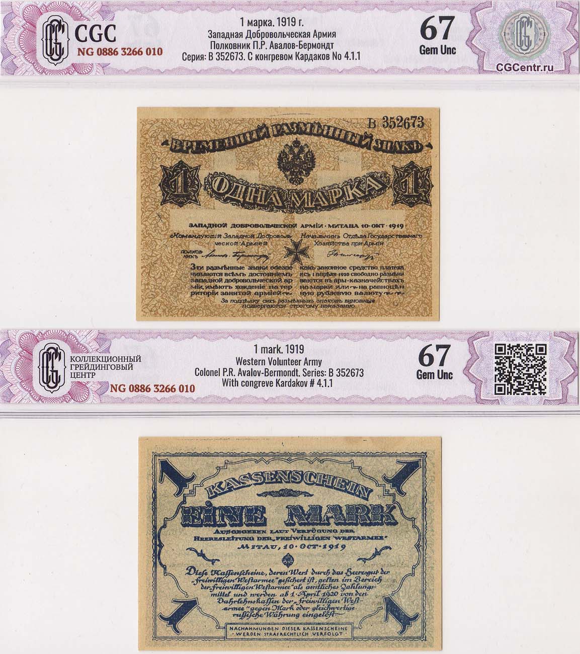 Серия В №352673. Кардаков №IV.1.1. С оборотной стороны повтор текста на немецком языке. С оборотной стороны повтор текста на немецком языке. 67 Gem UNC.