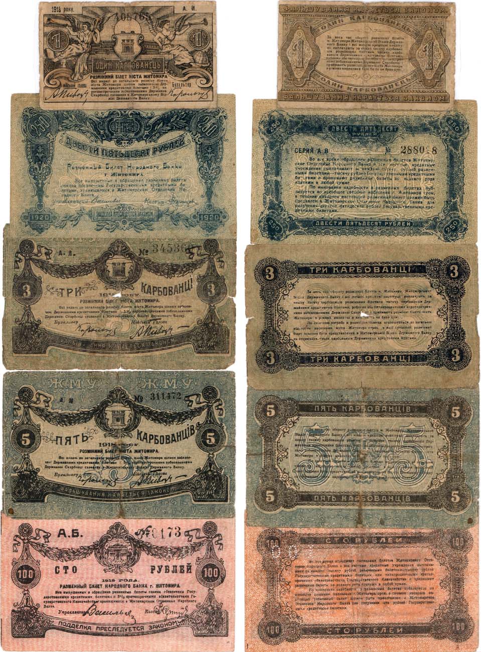 Разменные билеты Житомира 1918-1920 гг. 250 рублей 1920 года. 100 рублей 1919 года. 5 карбованцев 1918 года. 3 карбованца 1918 года. 1 карбованец 1918 года. F/VF.