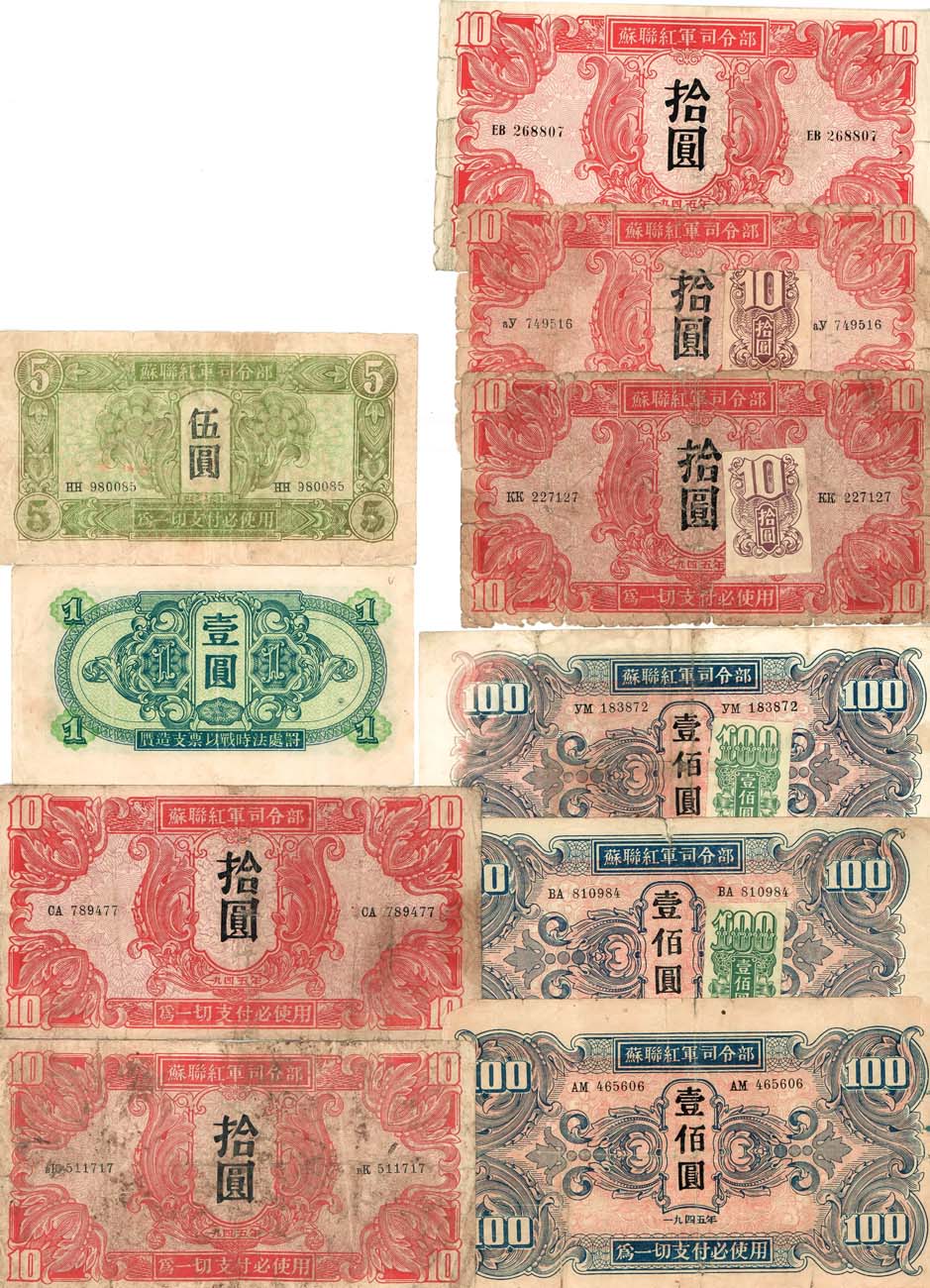 1 юань 1945 года. Кардаков XIV.9.1. Pick M31. VF/XF. 5 юаней 1945 года. Кардаков XIV.9.2. Pick M32. VF-. 10 юаней 1946 года. Выпуск в Дайрене с контрольными марками. Кардаков XIV.10.1. Pick M35. F-. 10 юаней 1946 года. Выпуск в Дайрене с контрольными марками. Кардаков XIV.10.1. Pick M35. F-. 10 юаней 1945 года. Тип 2. Кардаков XIV.9.3. Pick M33. VF-. 10 юаней 1945 года. Тип 2. Кардаков XIV.9.3. Pick M33. F/VF-. 10 юаней 1945 года. Тип 2. Кардаков XIV.9.3. Pick M33. F/VF-. 100 юаней 1945 года. Кардаков XIV.9.4. Pick M34. F. 100 юаней 1946 года. Кардаков XIV.10.2. Pick M36. F. 100 юаней 1946 года. Кардаков XIV.10.2. Pick M36. VF. F/XF.
