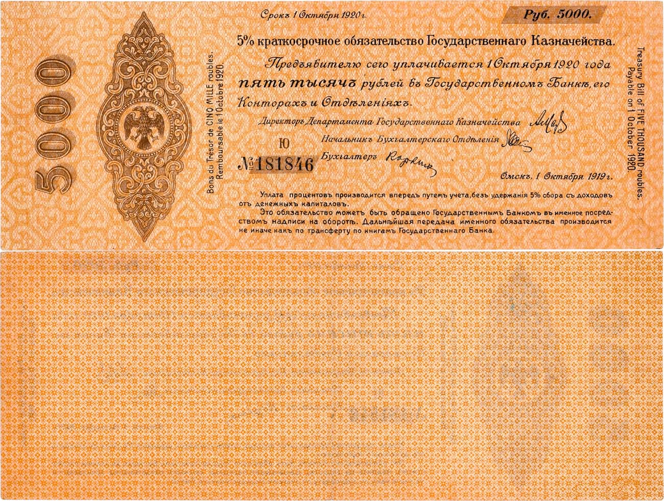 Изначально 5% краткосрочные обязательства были подготовлены к выпуску Временным Сибирским Правительством. (Председатель - П.Я. Дербер, П.В. Вологодский). Но уже с 1 декабря 1918 года с использованием клише обязательств Сибирского Временного Правительства в 500, 1000 и 5000 рублей стали выпускаться такие же 5; обязательства Государственного казначейства Временного Российского Правительства (верховный Правитель - адмирал А.В. Колчак).