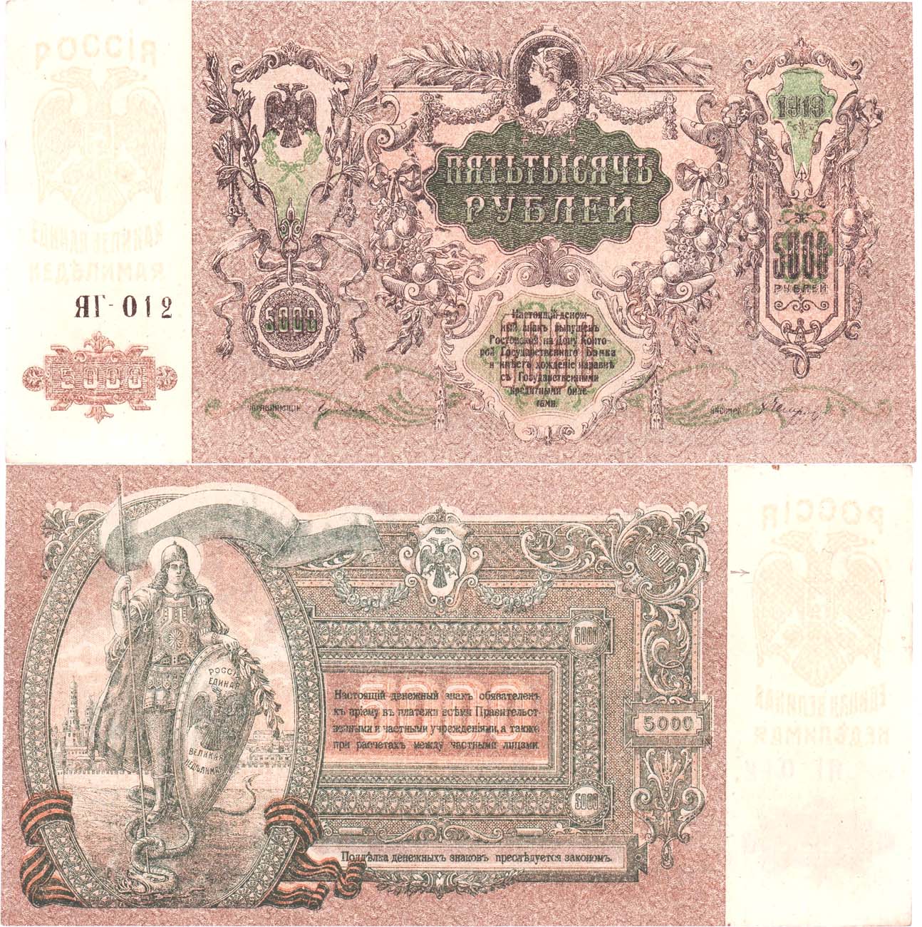Серия ЯГ-012. Водяной знак мозаика. Номер трехзначный. Выпуск Феодосия, 1920 год. Рябченко №3006р (5д). Растровая печать орла на поле. aUNC.