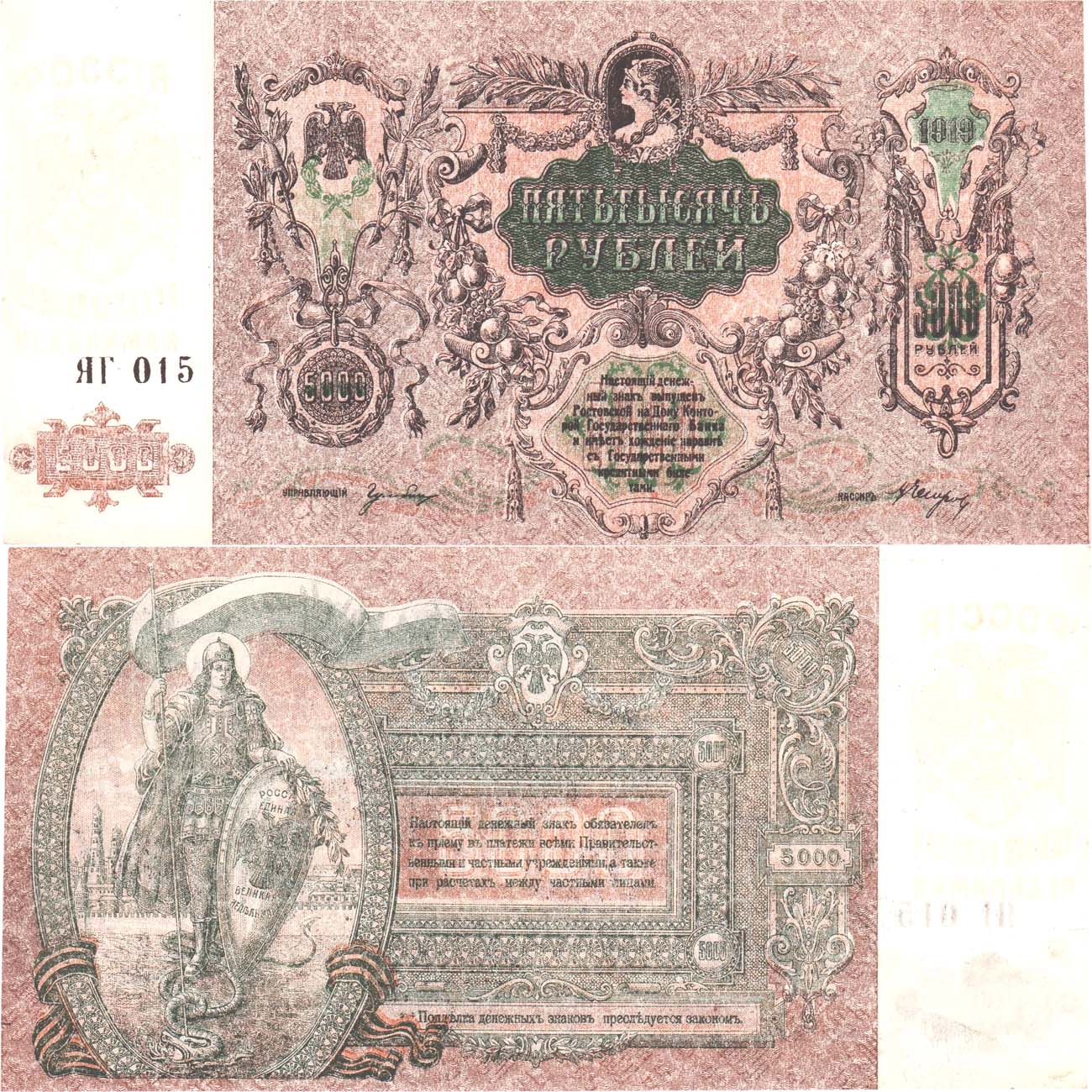 Серия ЯГ-015. Водяной знак мозаика. Номер трехзначный. Выпуск Феодосия, 1920 год. Рябченко №3006р (5д). Более темная печать на аверсе. Нехватка краски. aUNC.