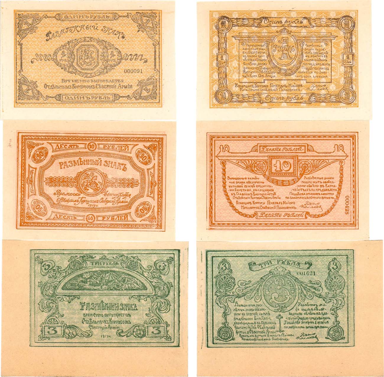1 рубль 1919 года. Разменный знак. №000091. Кардаков III.3.2. Истомин 125.2.1. UNC. 3 рубля 1919 года. Разменный знак. №001621. Смещение вправо и вверх. Кардаков III.3.3. Истомин 125.3.1. UNC. 10 рублей 1919 года. Разменный знак. №000428. Кардаков III.3.5. Истомин 125.5.1. UNC. Типография Б. Мянса, Ревель (Эстония). UNC.