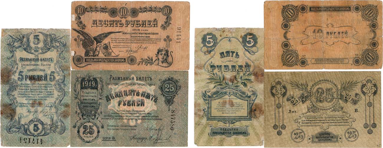 Елисаветград. Разменный билет. 5 рублей 1919 года. Серия 417154. Кардаков V.23.10. Истомин F1143.1.1. Елисаветград. Разменный билет. 10 рублей 1918 года. Серия 91441. Кардаков V.23.5. Истомин F1141.3.1. Елисаветград. Разменный билет. 25 рублей 1919 года. Серия 3 №847580. Cерия 3. Литера В. Фон с добавлением зеленых точек. Кардаков V.23. 11b. Истомин F1143.2.3b. VF-/AU.