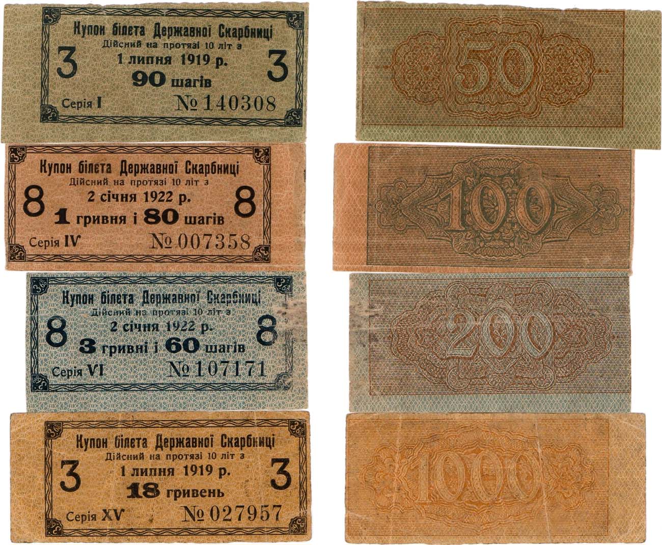 Купон билета Державной Скарбницы. №3. Серия XV №027957. 18 гривен 1919 года. Купон билета Державной Скарбницы. №3. Серия I №140308. 90 шагов 1919 года. Купон билета Державной Скарбницы. №8. Серия IV №007358. 1 гривна и 80 шагов 1922 года. Купон билета Державной Скарбницы. №8. Серия VI №107171. 3 гривны 60 шагов 1922 года. VF/XF.