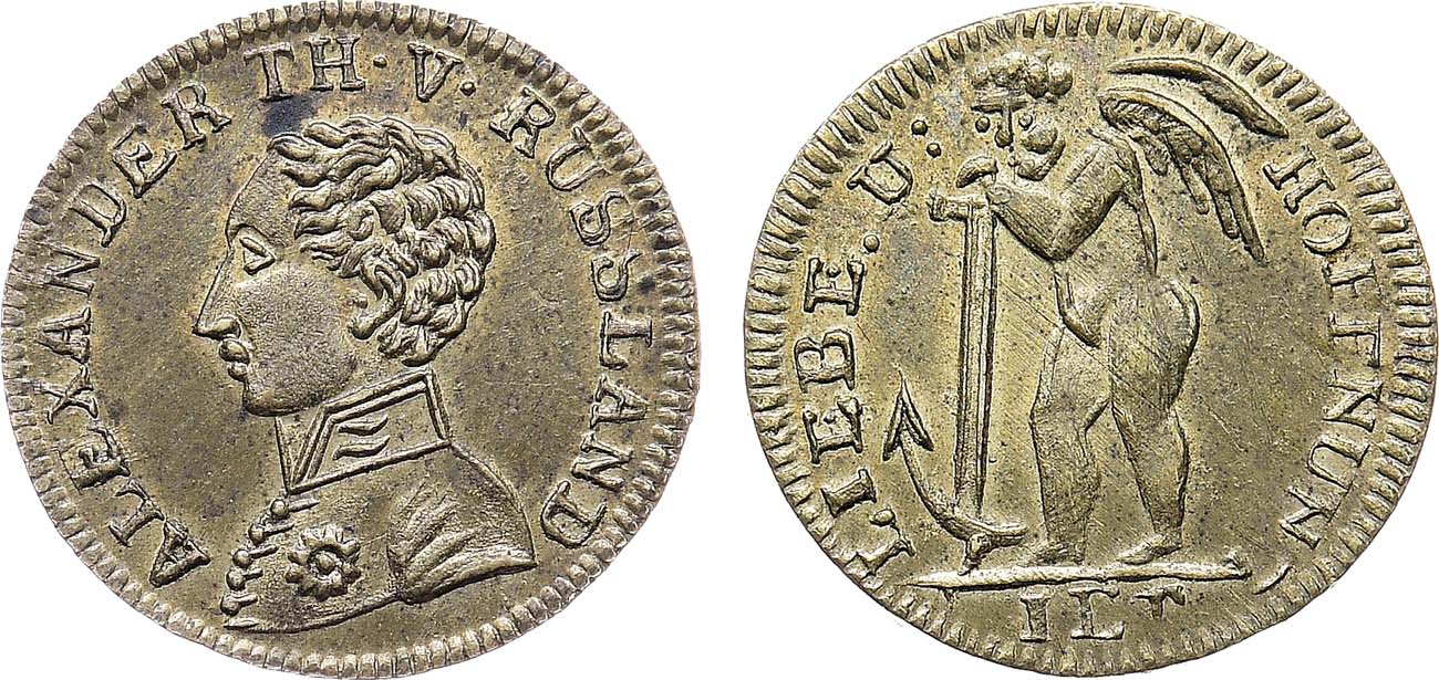 Бронза. 1,38г. Диаметр 17 мм. Германия. Нюрнберг. Аверс: Погрудный, профильный, обращенный влево, портрет императора Александра I в мундире, со звездой. Надпись по окружности: ALEXANDER TH. V. RUSSLAND [Александр I, Император России]. Реверс: О якорь опирается Амур. Надпись по окружности слева и справа: LIEBE. U: HOFFNUN[G] [Любовь и надежда] В обрезе полустертая надпись: IET. AU.