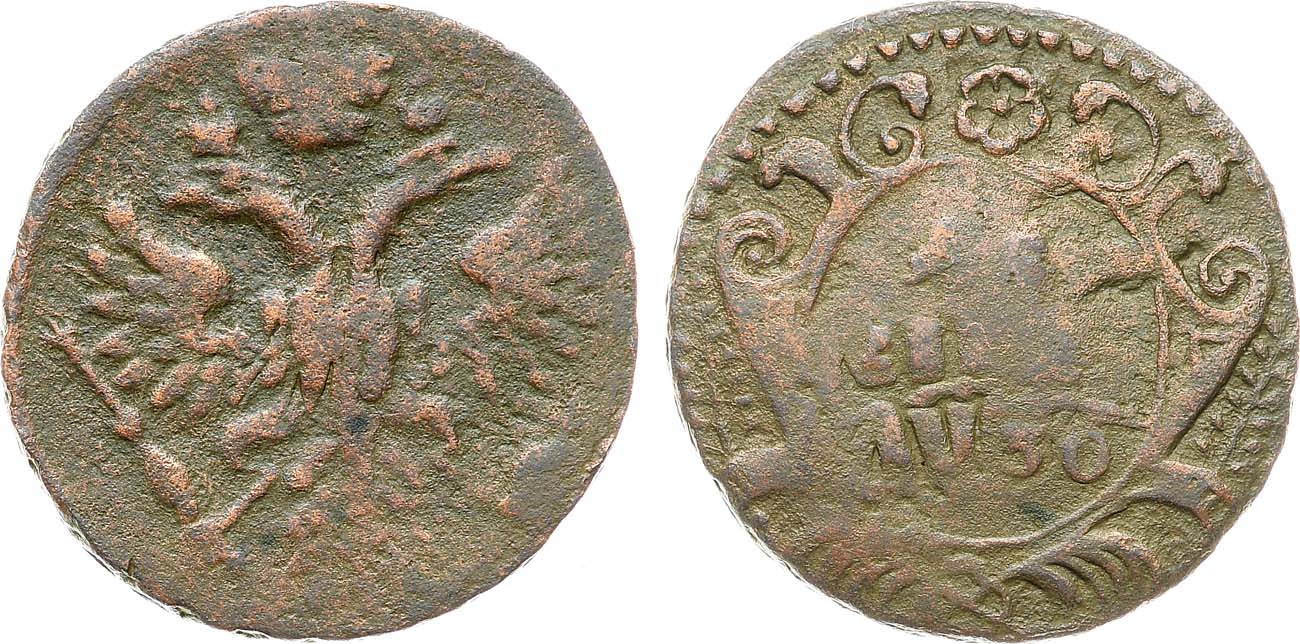 Медь. 6,64г. Красный монетный двор. Аверс: крест державы узорчатый, лавровая ветвь из 13 листьев. Перечекан из 1 копейки Петра I. Гурт сетчатый. Уздеников 2481. Биткин 265. Дьяков 26, 4. Brekke 77, 18. F.