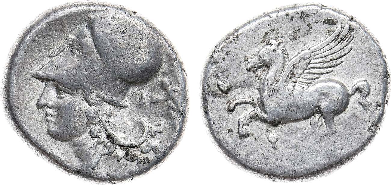 Серебро. 8,35г. Коринф. Аверс: голова Афины в коринфском шлеме - влево. Реверс: бегущий Пегас влево. BCD Corinth 107. HGC 4, 1848.. XF/AU.